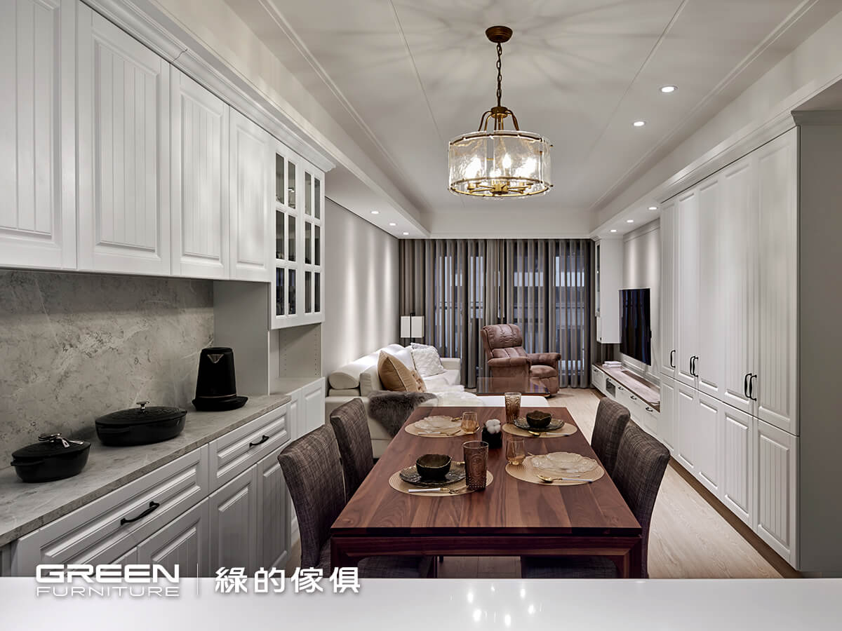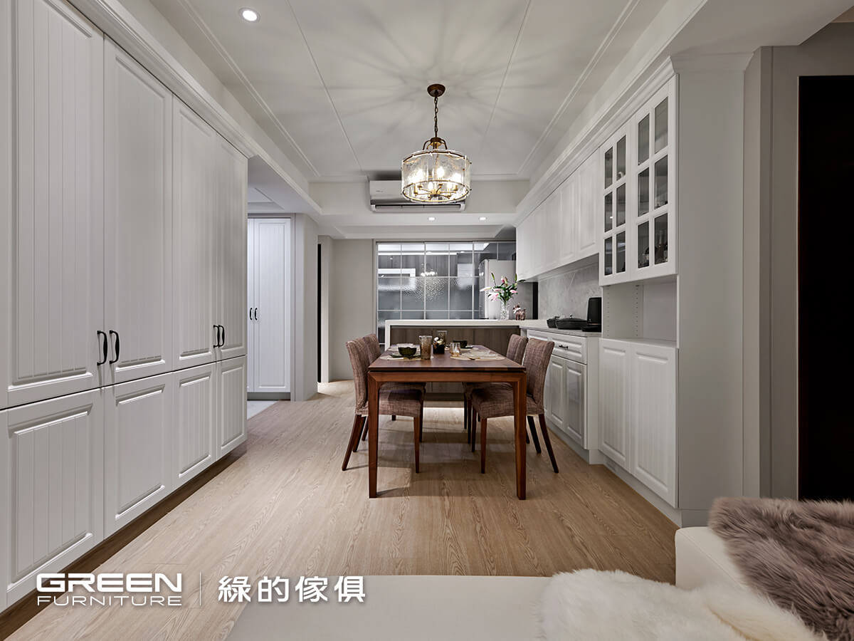 走進客廳與餐廳所構成的開放式公領域,一眼就能感受到空間的流動與溫度。設計師運用一座高櫃作為巧妙的分界,讓客餐廳區域界線明確,卻不被硬性切割,空間感更顯通透。牆面以溫暖奶茶色鋪陳出柔和氛圍,搭配綠的傢俱經典的鄉村白系統櫃,散發低調卻耐看的優雅氣質,再點綴一張珍珠白沙發,把鄉村風格的質樸與高雅拿捏得剛剛好。天花板則以對稱線條勾勒出古典層次,提升整體設計感。這樣的系統傢俱規劃,不只是美觀,更讓夫妻倆在日常生活中能自在享受每一刻。綠的傢俱在設計過程中貼近屋主的生活習慣,讓空間更符合實際使用,真正實現專屬家的溫暖風格。