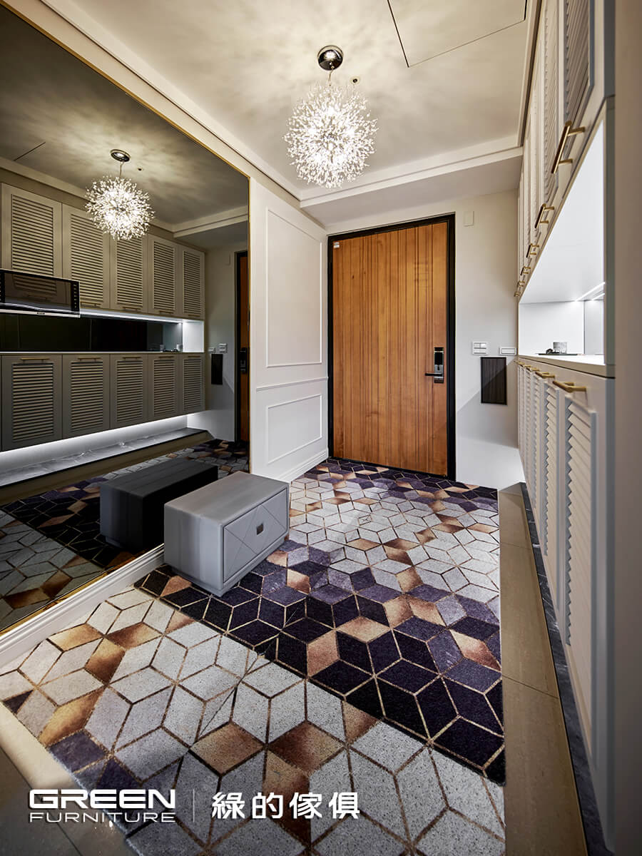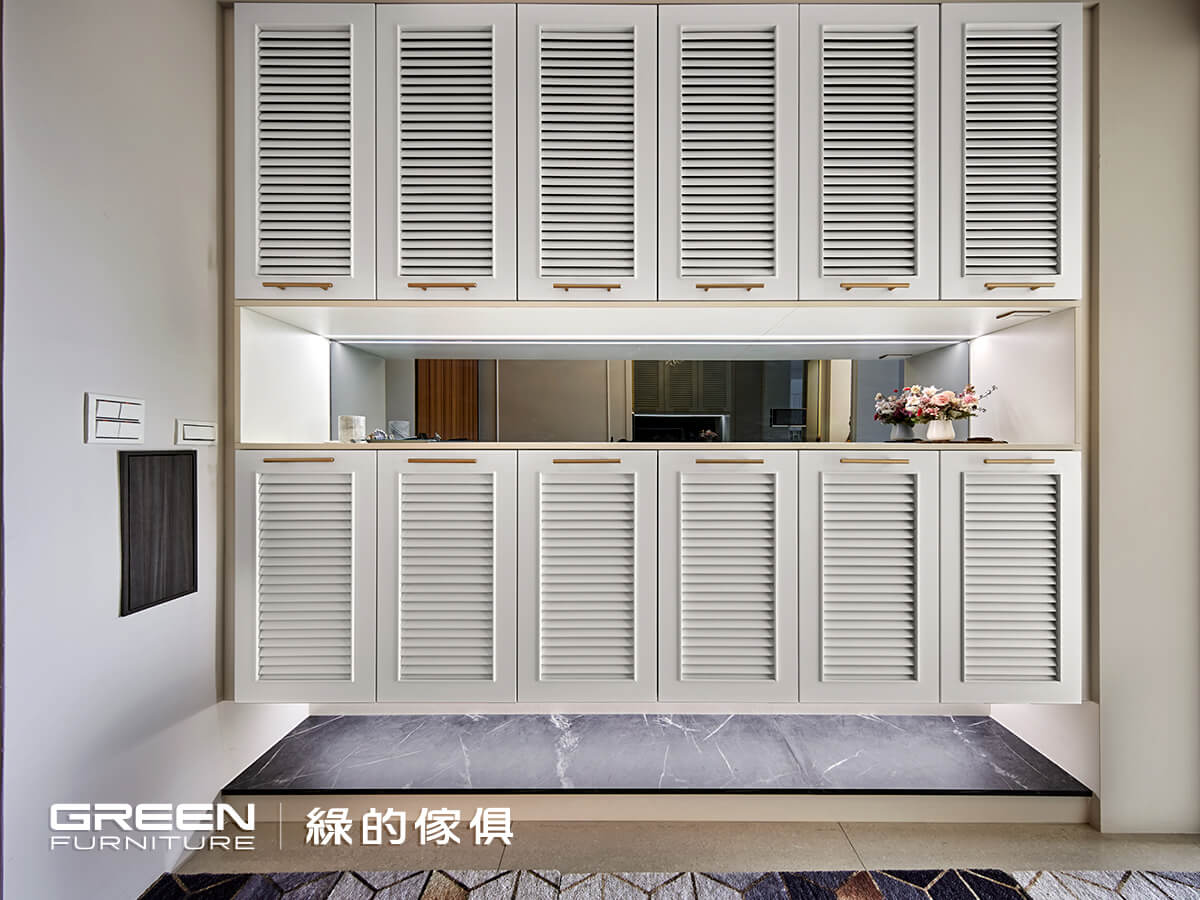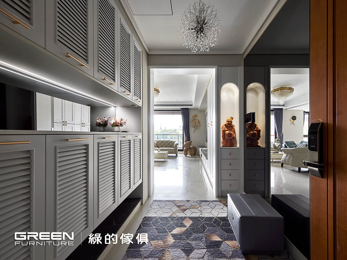 進屋就能感受到溫雅的氣息打破空間,與典雅的白色鞋櫃相互映襯,將玄關廊道與櫃體結合提升機能,能存放百雙鞋子的收納量滿足屋主需求之外,透氣門片更適合存放鞋子,藉由拱門當作轉折引導整體的視覺動線並有效做空間區隔,打造典雅浪漫的居家端景。