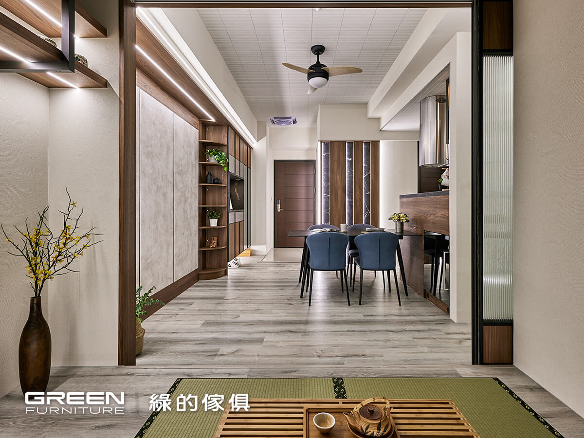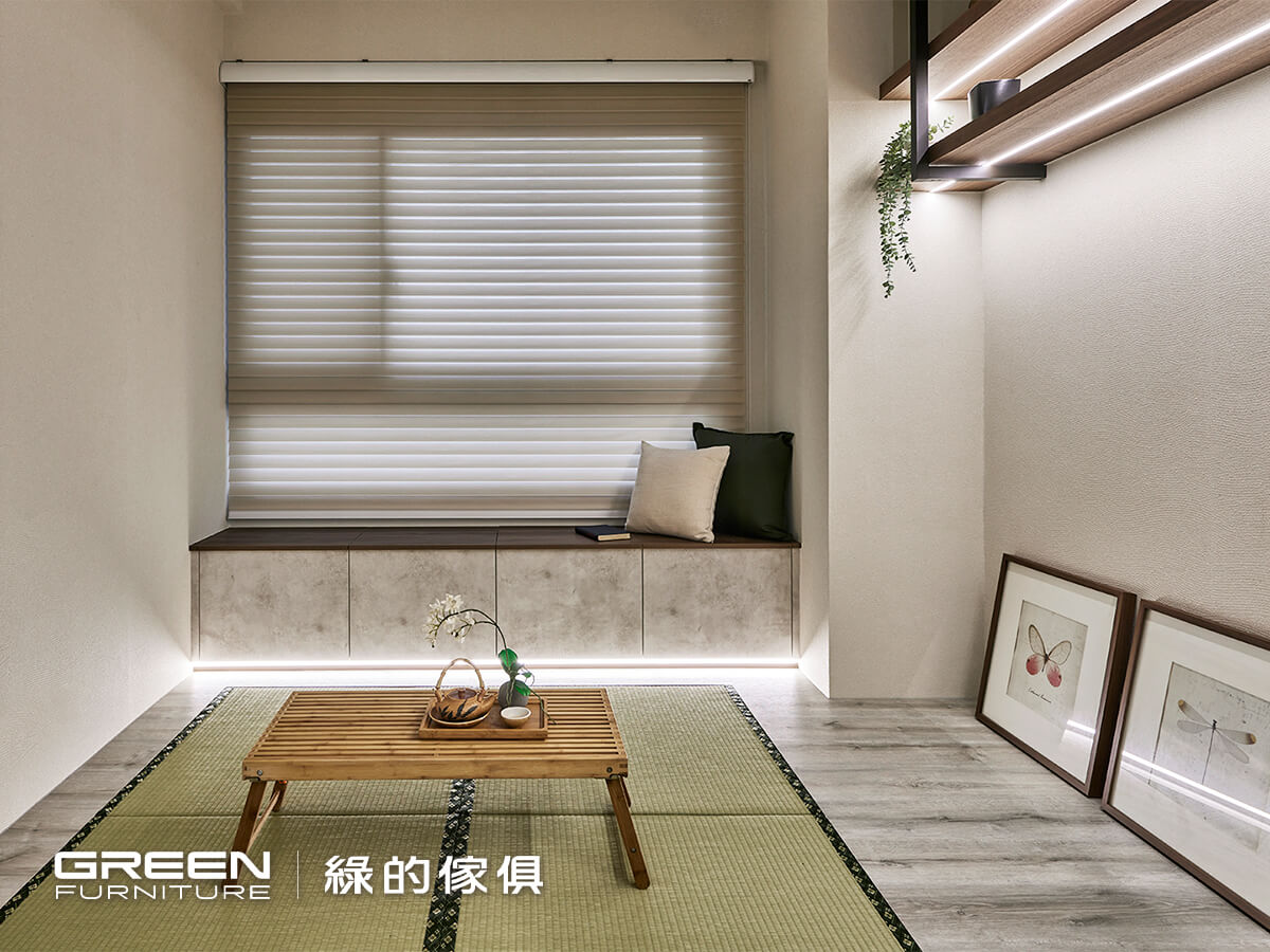 地板鋪上擁有淡雅青草香的淺綠色塌塌米,與周圍的木紋地板形成溫潤對比,不僅讓整體空間更具和風氛圍,也展現出主人家對細節的講究與品味。這樣的配色與材質運用,是許多尋求和風室內設計靈感的屋主首選。