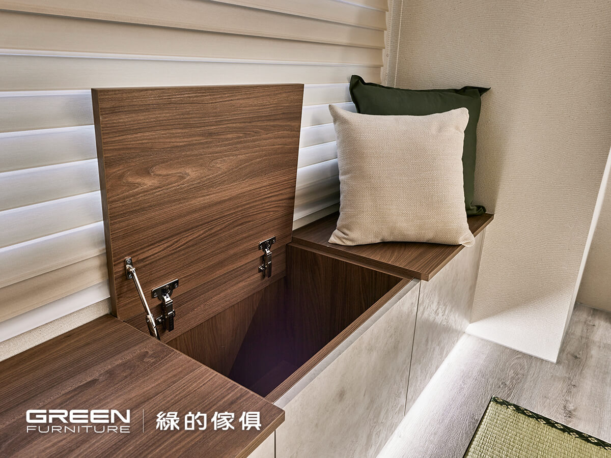 拉門內部的和室區域,靠窗設置了整合收納機能的臥榻空間,不僅能收納坐墊、棉被與寢具,更提供日常休憩、閱讀或小型聚會的多元使用彈性。搭配量身打造的系統櫃與系統傢俱,充分發揮每一寸坪效,讓和室兼具美感與實用。