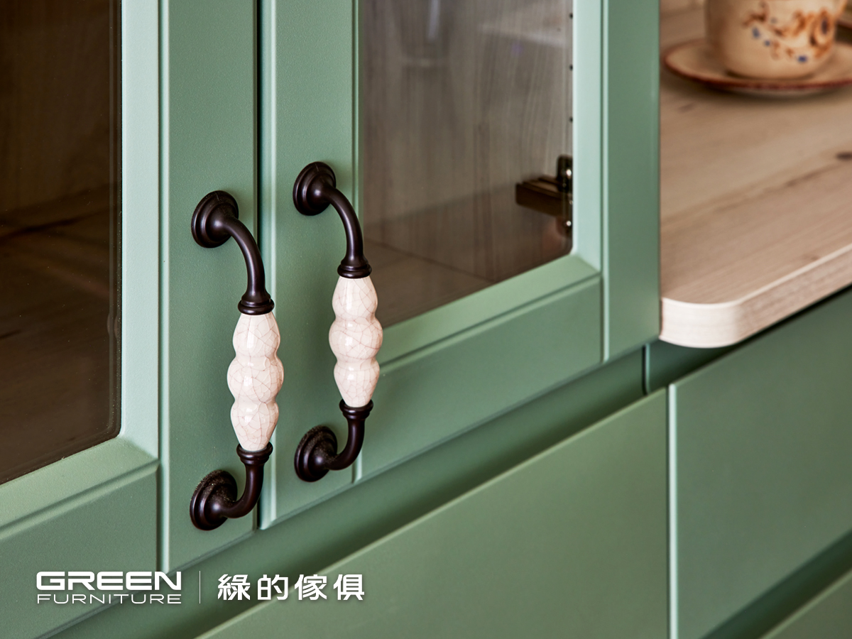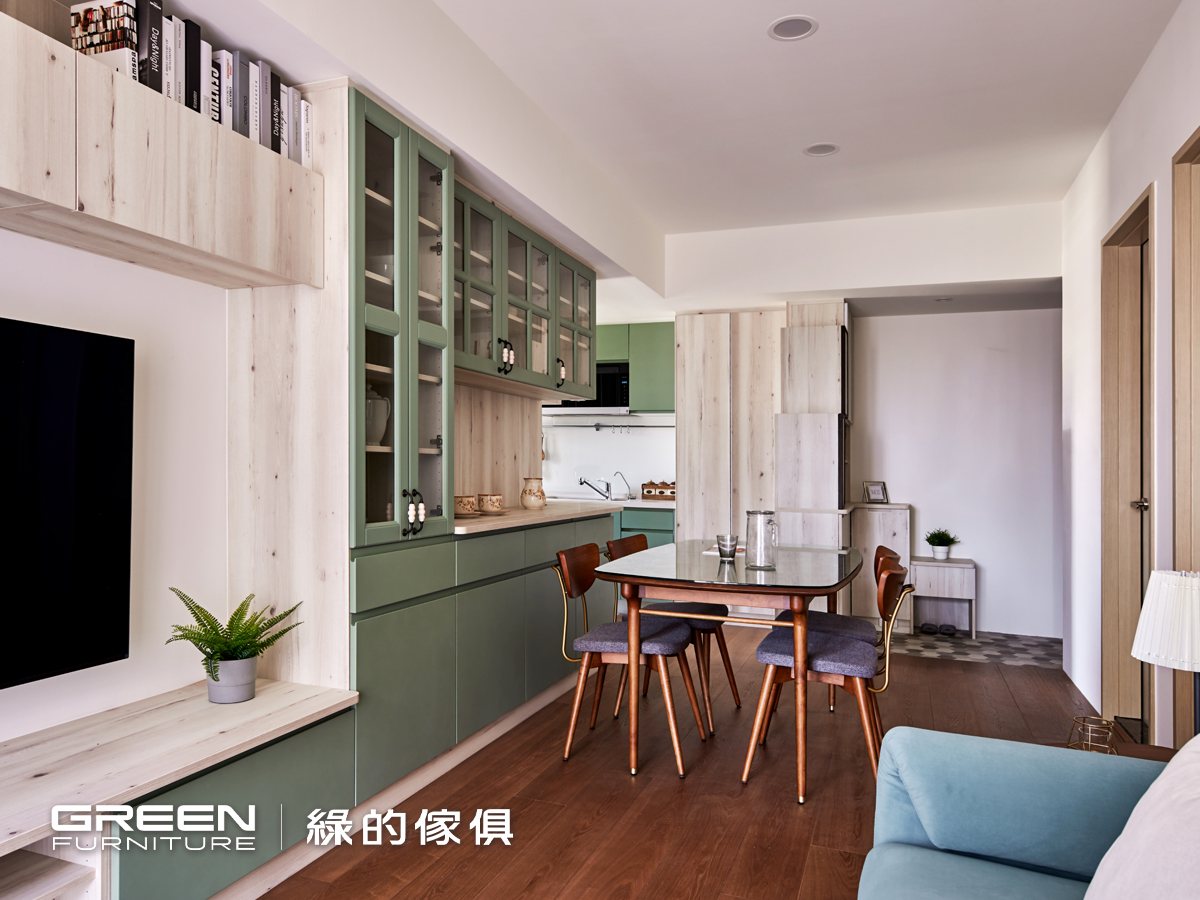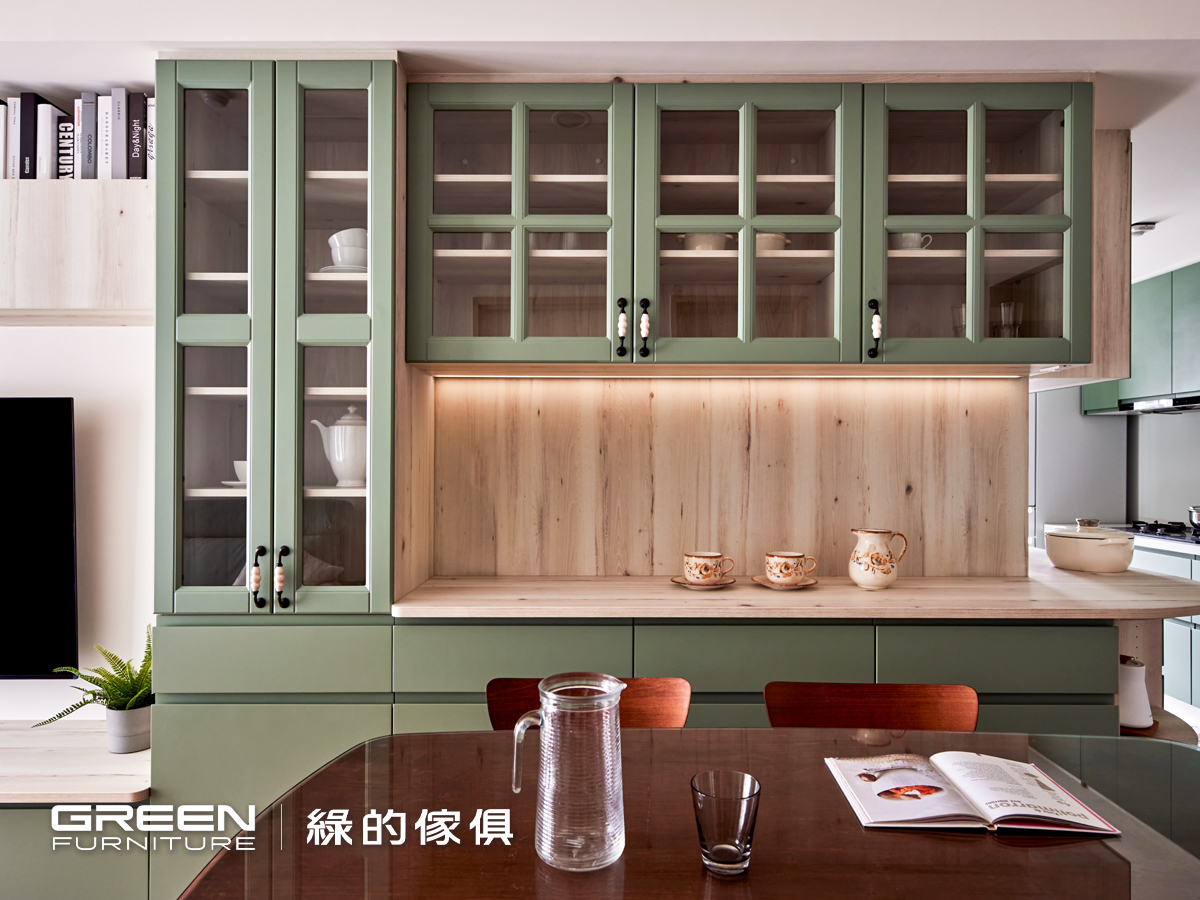 而電視牆上方的懸吊式淡木色系統櫃則延續鄉村風調性,在視覺上與秋谷綠的櫥櫃形成柔和共鳴,達到一致性美感。不只是好看,這些系統傢俱設計也實用得恰到好處,不論是日常收納、機能分區或是展示機能都考量得十分到位,正是綠的傢俱一直以來最擅長的整合設計。透過細膩的材質搭配與空間規劃,這座以鄉村風櫥櫃為主軸的室內設計案,不僅具備高顏值,也充分體現機能與風格並重的生活美學