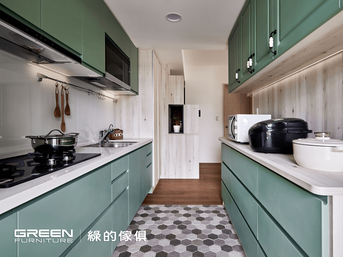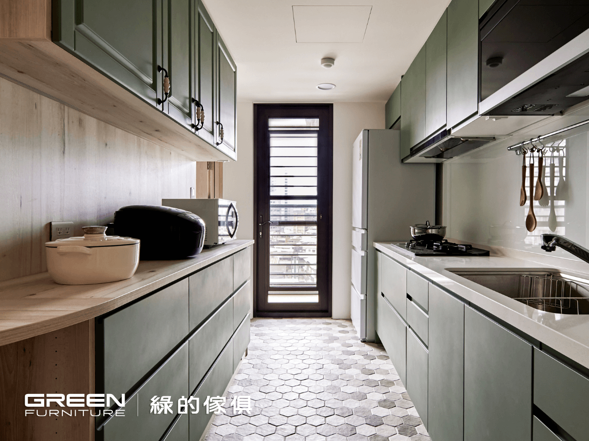 秋谷綠的鄉村風櫥櫃映入眼簾,整室設計深深受到綠色的影響,恍如置身於大自然之中。秋谷綠陶瓷烤漆搭配淡木色的檯面與背板,餐櫃櫃體門片點綴著古典的陶瓷把手,這座鄉村風櫥櫃,美得令人目酣神醉。