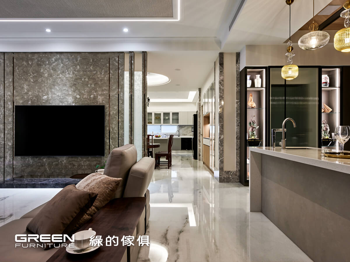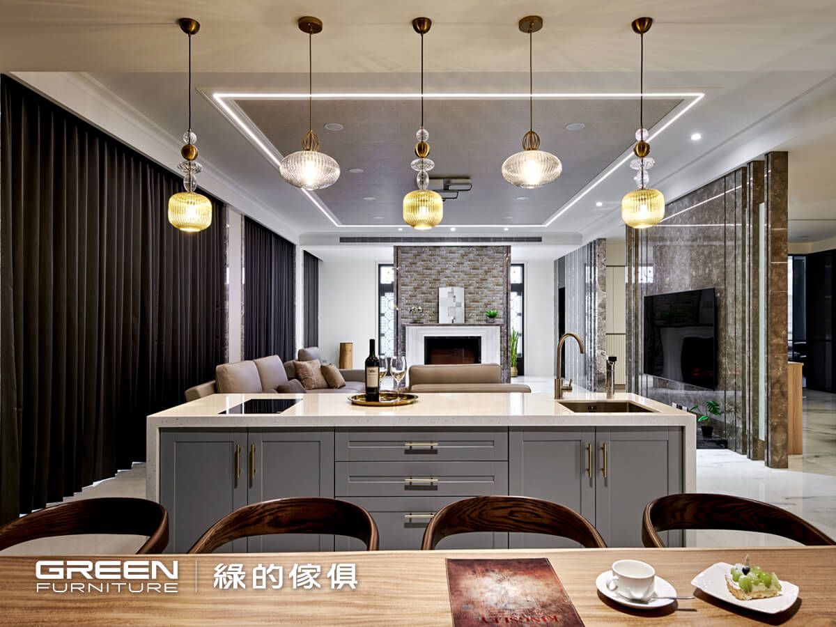 與此同時,深知公領域將是祖孫三代齊聚共樂的重要所在,設計師即以挑高客廳維持開闊視界,同時落下一道中島吧台,既是公領域的柔性介質,亦可擴增活動空間與生活機能,充滿藝術感的玻璃枝形吊燈,更帶來畫龍點睛效果;就算一次容納逾十人也不成問題,當夫妻倆的兒女子孫回家團聚時,便能不顯擁擠狹促,各自擁有舒心尺度。