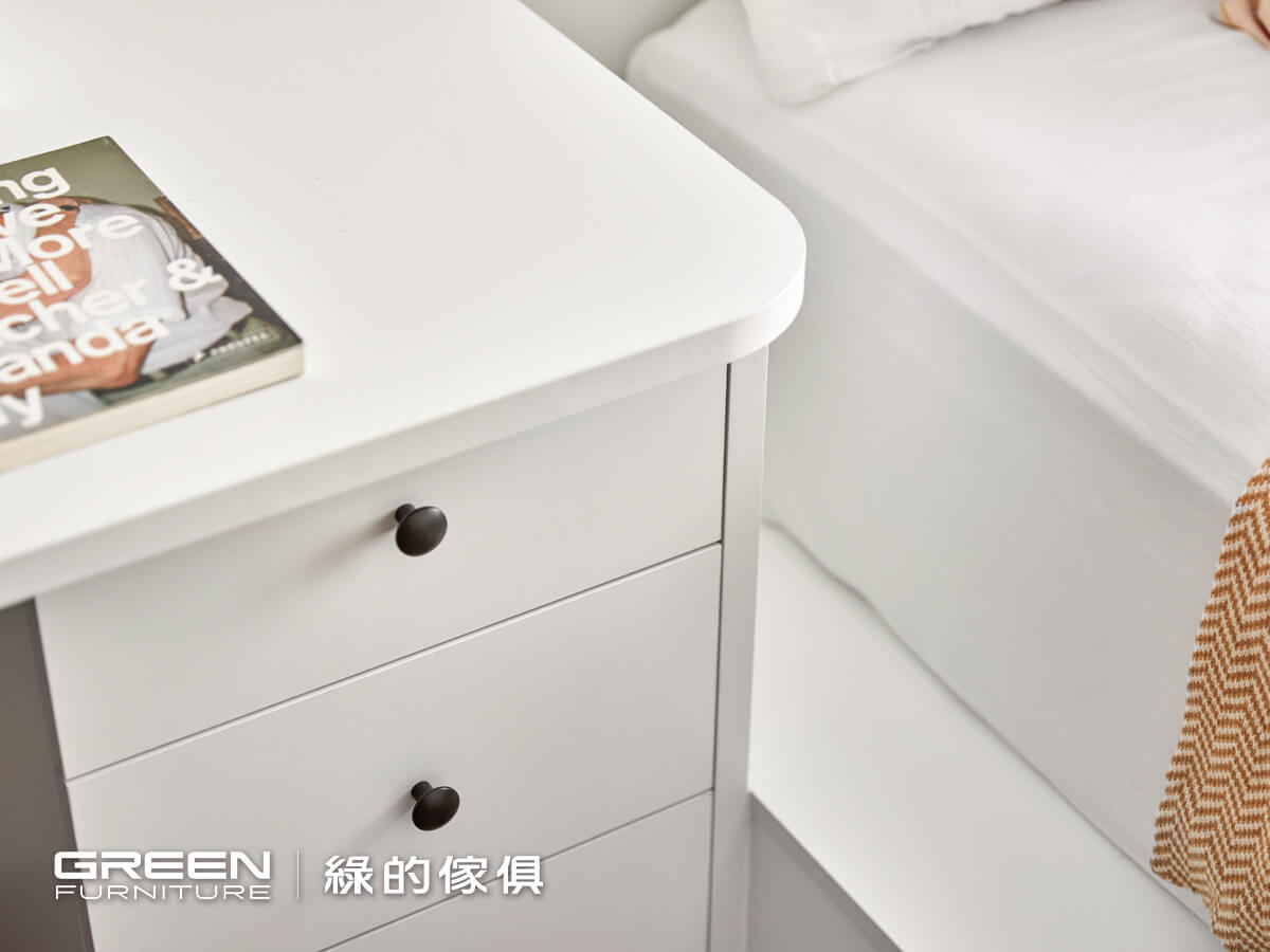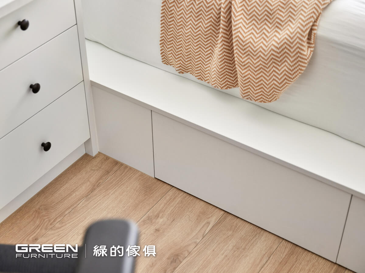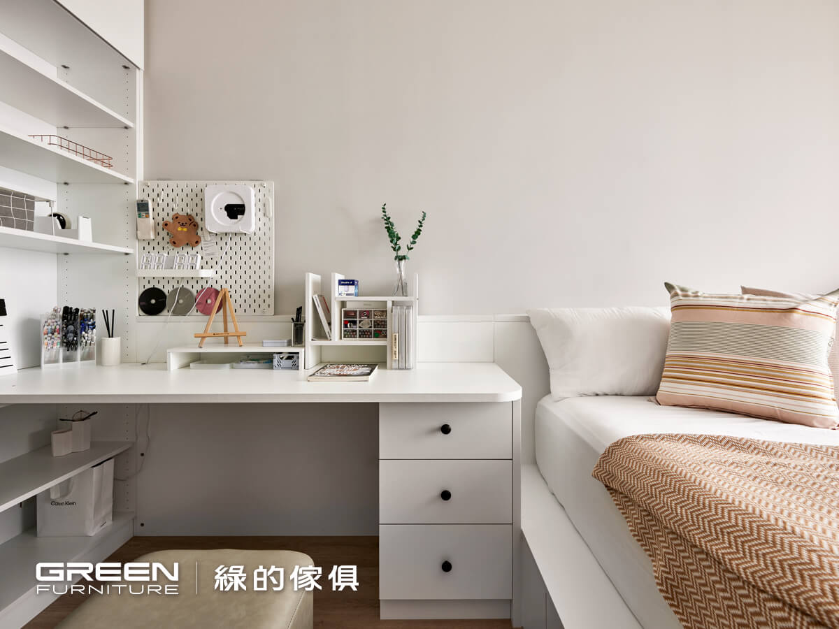 女兒鍾愛白色系,房裡純白潔淨的空間,滿足每個女孩心中的夢想。衣櫃以白色為基底,襯以些許冰灰,復古雕花的把手更為這櫥櫃增添些許夢幻。與床板緊鄰的書桌以弧形拉開造型,一字型的櫥櫃連結書桌,依舊是一襲白色。量身定做的床架下方為按壓式抽屜,床架、床頭與抽屜櫃,也以滿版鑼帛鋪墊。
