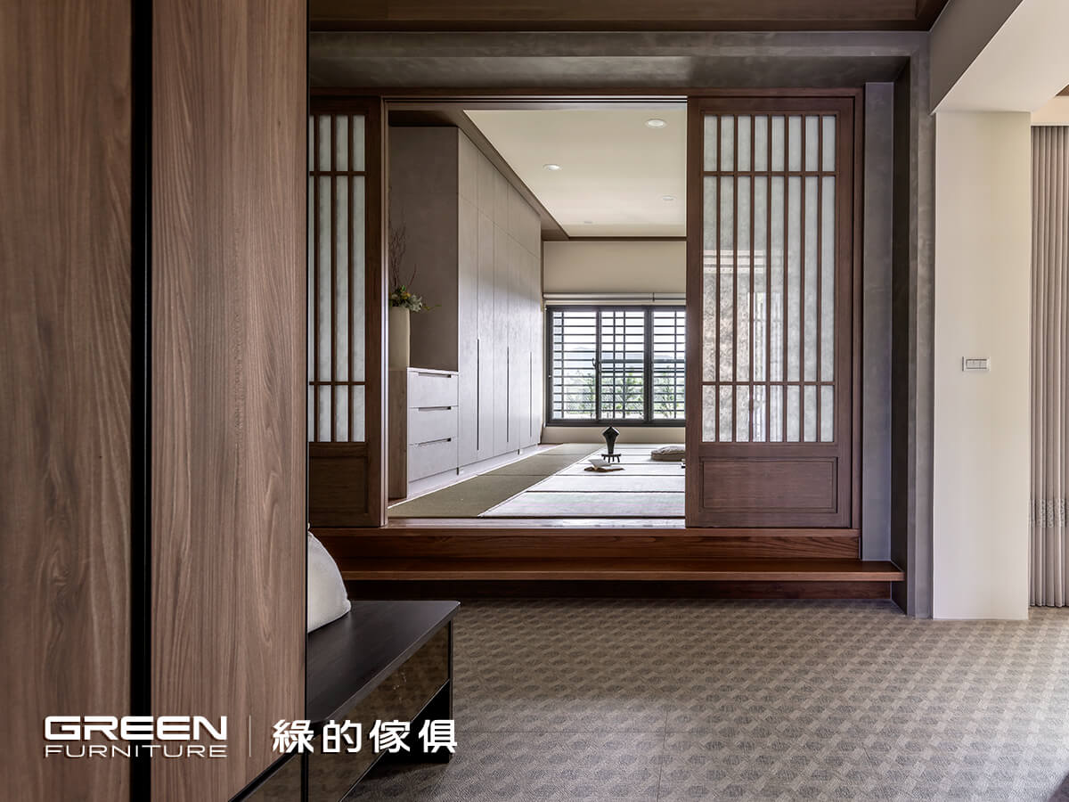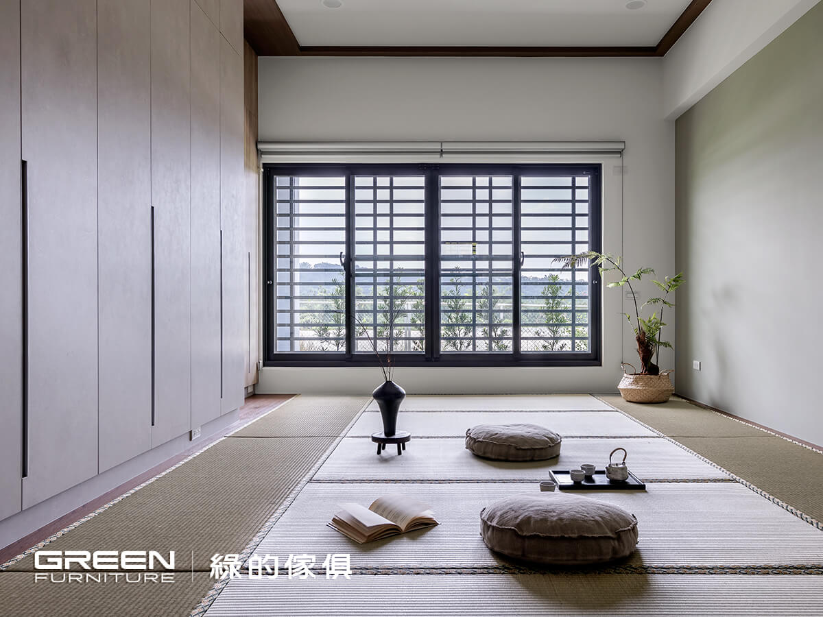 拾級而上,屬於日式侘寂的寂靜氛圍頃刻透散,專門手工訂製 11 張榻榻米,天然的草料素材,使人們無論坐站或躺臥,均能感到溫潤柔和的觸感,當女兒們帶著先生與孩子們歸家時,即可感受到來自父母無微不至的關懷,不只地坪用心別緻,壁櫃也有著獨到心思。