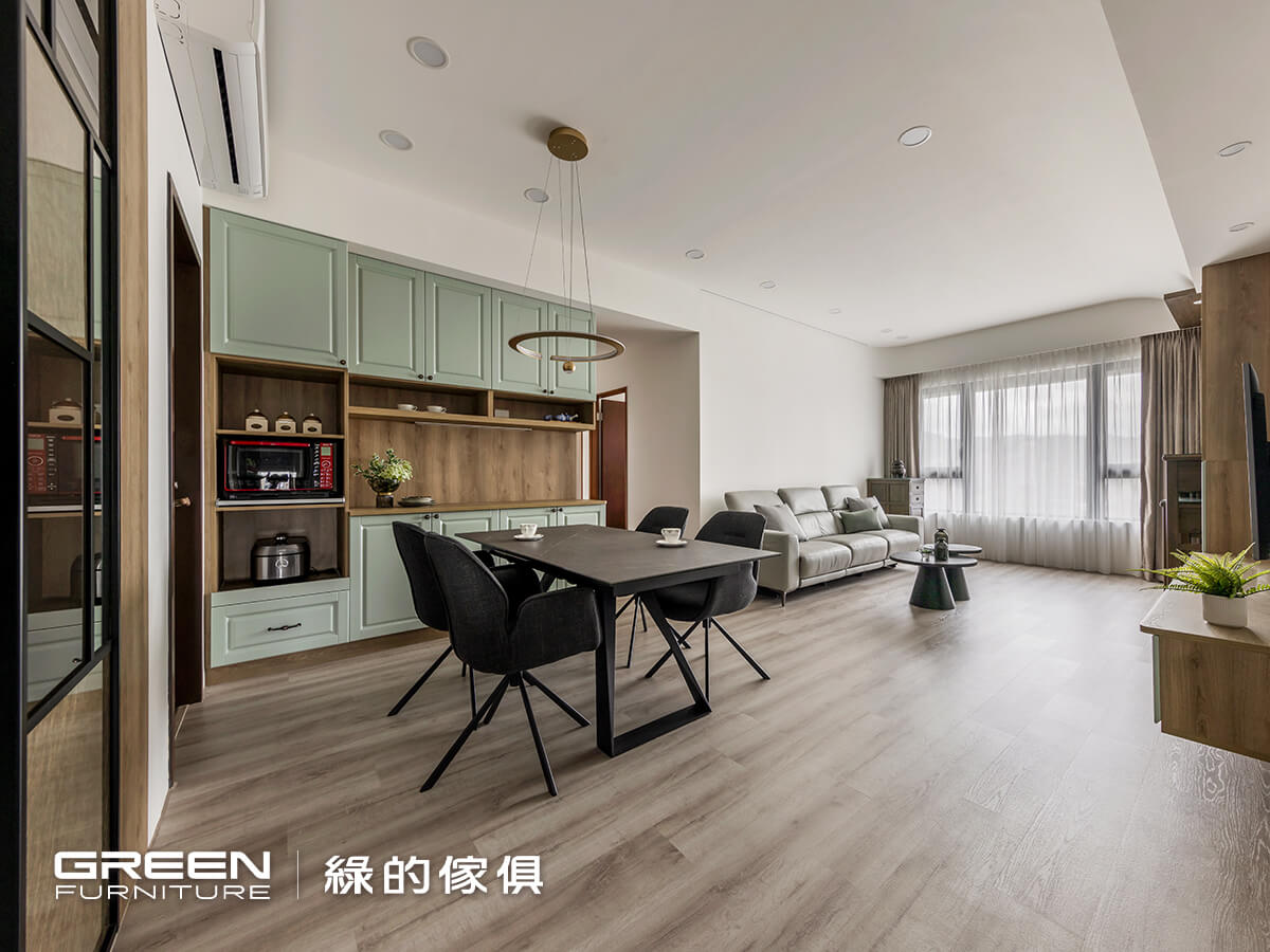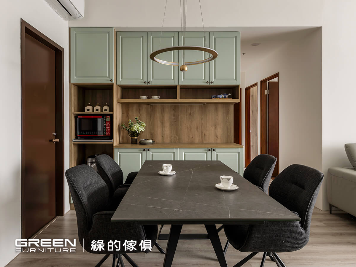 為了滿足廚房空間延伸的需求,設計師以同款曙光青烤漆美式鄉村系統板在餐廳打造大容量系統櫃,提供兼具美觀與實用性的收納規劃。