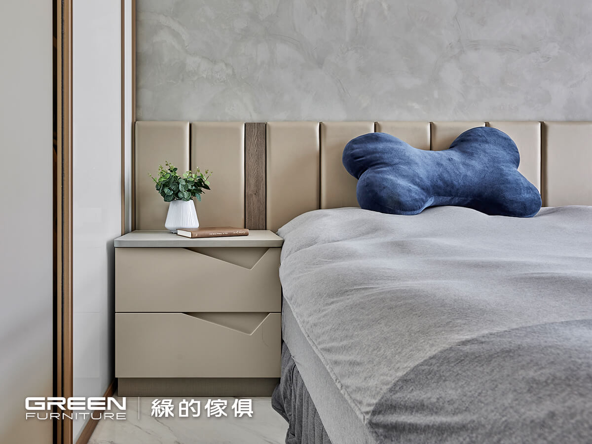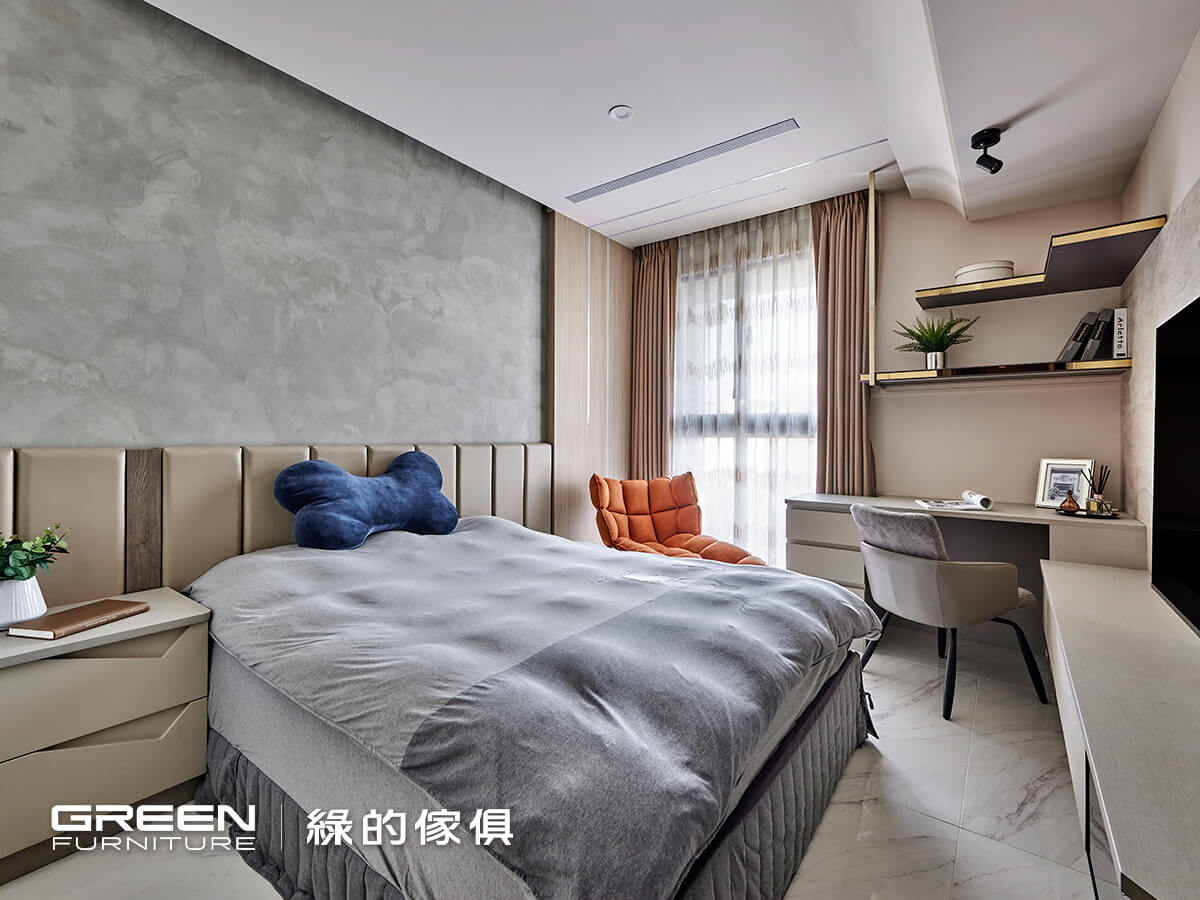 簡而不單的情境,源自以霧灰奶茶色當作基調,搭配心所屬的洞石體現溫樸氣息,依序挹注格柵線條精緻細節,同步根據生活習慣,於窗邊騰出空白,鑲佐二道燈帶烘托簡約氣息,當擺上女兒所傾心的單椅,即成為平時沐浴晨光、短暫歇息的一席角落。依序沿著壁面量身訂製書桌與矮櫃,以連續性設計使每寸空間妥善運用,涵蓋床頭櫃亦是突破系統傢俱的限制,於立面勾起一道簡約三角,在功能之外,體現耐人尋味的細節。