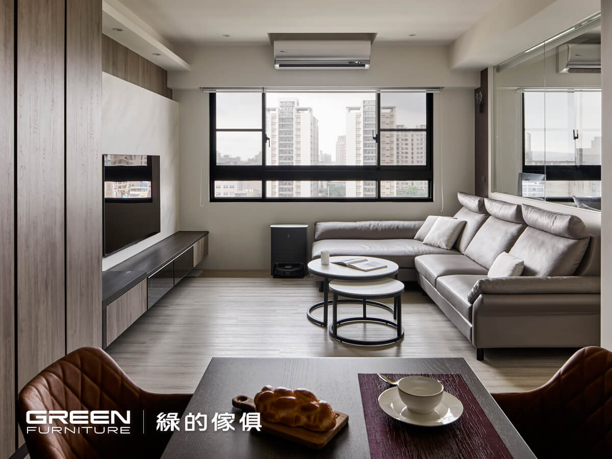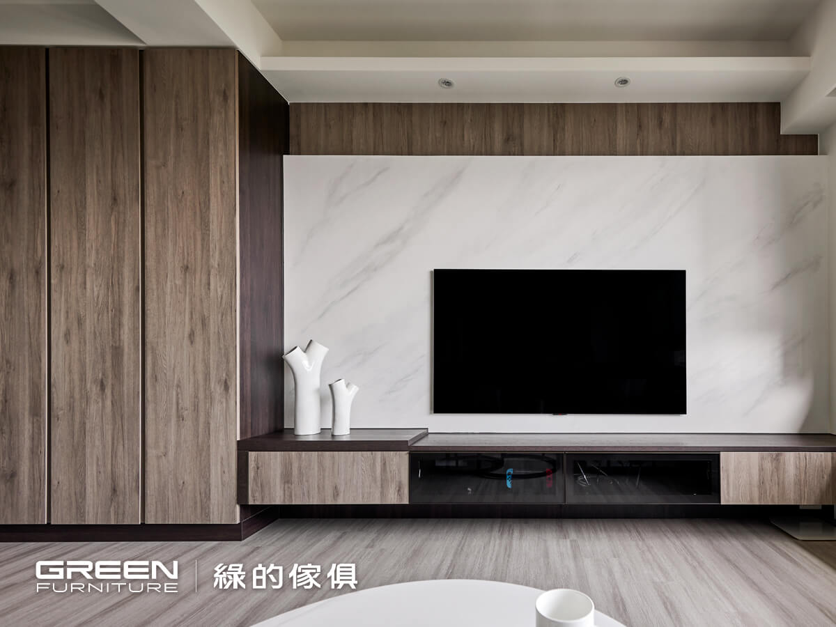 作為客廳的命脈電視牆,特選白色石紋板材達到畫龍點睛的效果,電視櫃下方櫃體,屋主平常置放遊戲機與網路機等設備,貼心規劃玻璃門片並搭配咖啡色鋁條把手,不僅美觀日後使用也不會留下指紋,大量的自然元素讓身處喧囂都市的人,進屋就能感受溫暖適切的居家氛圍。