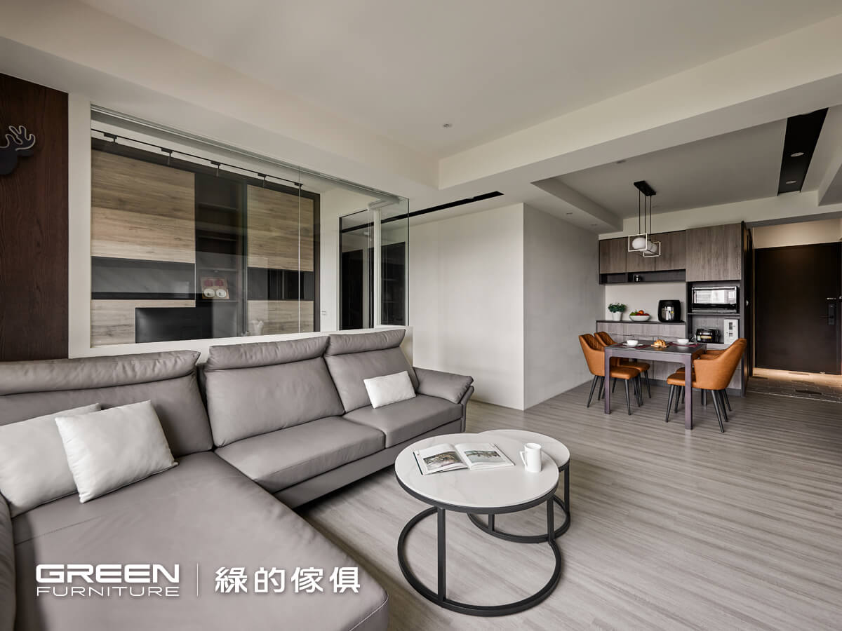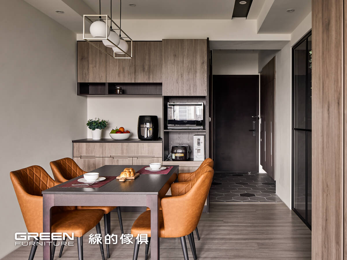 緊鄰玄關的是開放式餐廳及客廳,不特別劃定兩個區域機能,讓彼此能共享日光景緻,形成流暢寬闊的動線,利用同為木紋理的泥橡色和炭橡色交疊,讓櫃體在個性與柔和的律動中,增添設計趣味,使人入內就能感受到一股靜謐的寧靜氛圍,從玄關右轉向室內頂天立地的餐邊櫃即映入眼簾.除了有開放式的層架能置放瓶罐及馬克杯,最上方櫃體使用活動層板,可儲放生活備品及不常使用的家電,增加整體靈活度進而解決廚房收納不足的問題,運用深、淺兩種木色調穿插於餐廳區域,每日三餐也能感受被溫潤木質包覆的愜意感。