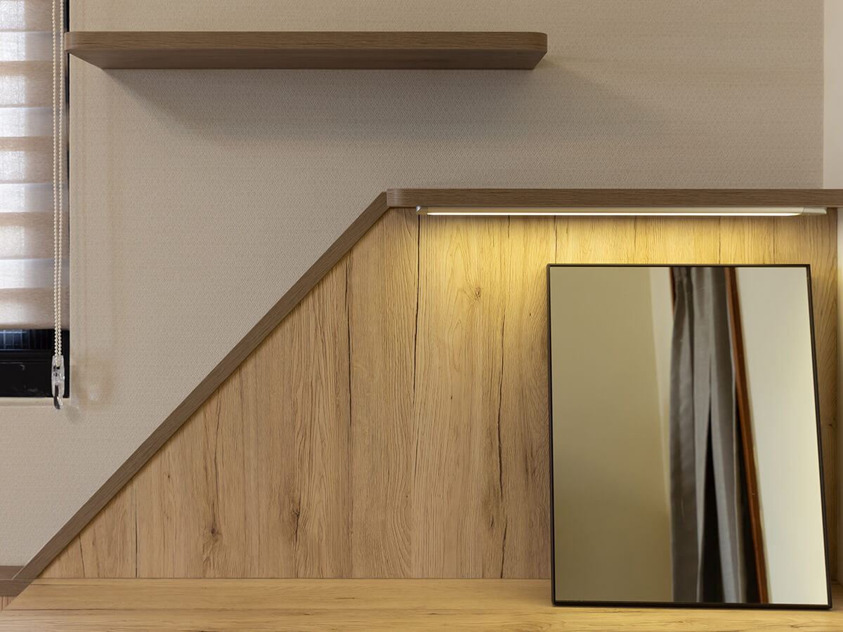 女主人沒有使用化妝桌的習慣,楊博筑就在主臥室沙發床頭櫃壁面上,單設一面方鏡,由鑲嵌在上方木框裡的LED燈發揮照亮功能,另在大衣櫃拉門內安設長條穿衣鏡,還給臥室更大的走動空間,而方鏡下面的木質壁材,深淺圖紋交錯互映,與男主人傾心挑選的收納櫃上原木紋、衣櫃拉門上皮革紋、其他房間的布織紋,織就一首花紋圖騰的交響曲。