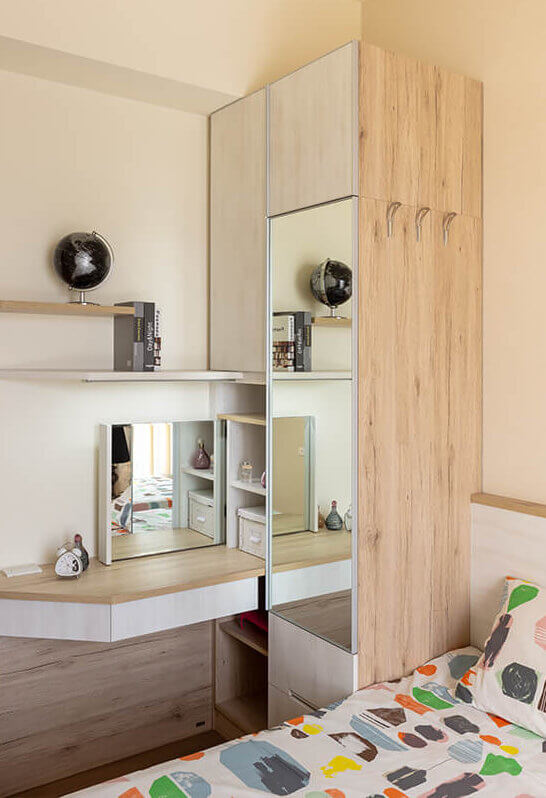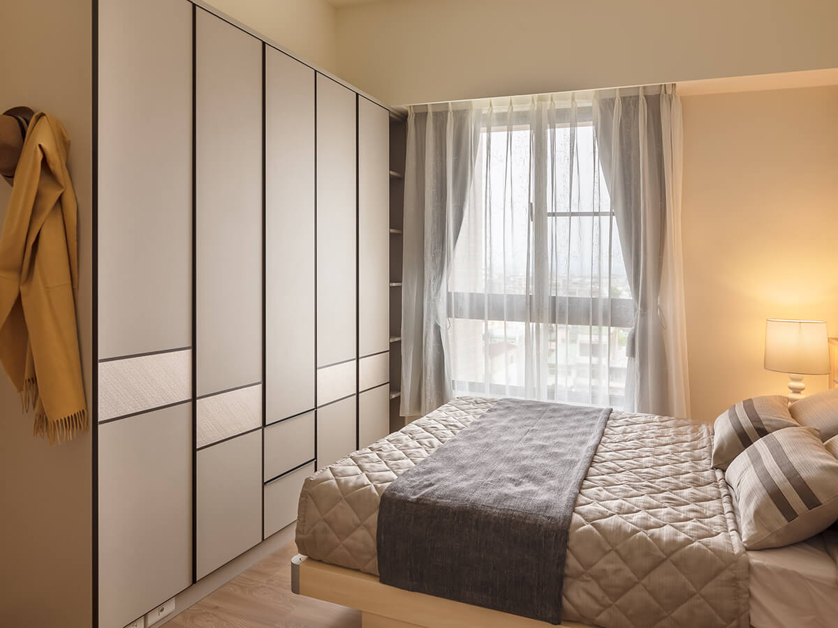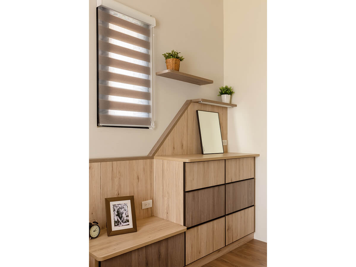 設計師的巧手魔法,尤以展現在成屋畸零空間的點石成金上,最為出奇,在女兒房間的窗子左邊,是轉角柱,柱子後面形成了凹深的畸零空間,楊博筑把它轉化設計為棉被收納櫃;同樣的,在主臥室的建築樑柱旁、充當客房的書房大樑下,也各自形成壁與窗後方的畸零空間,楊博筑精算凹槽的長寬高深後,配置拼組櫃體和拉門,活用空間收納不浪費,贏得屋主全家讚賞。