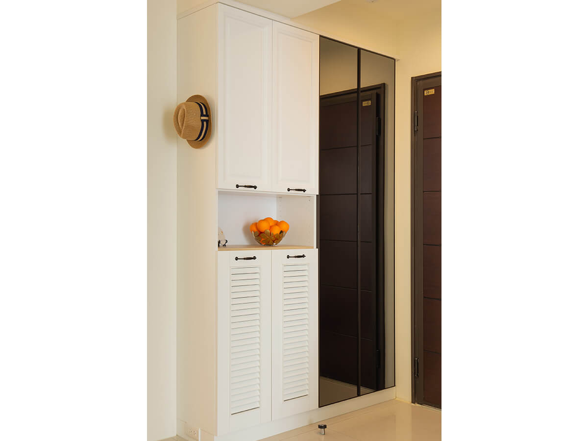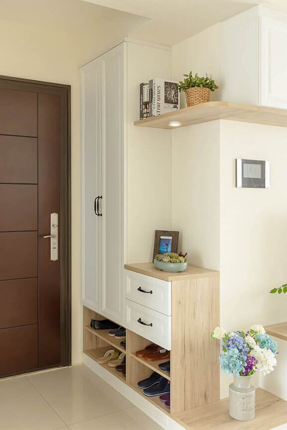 多層收納衣物鞋櫃最下方,刻意採開放式的鞋架,取用或脫放外出鞋、拖鞋都輕快。