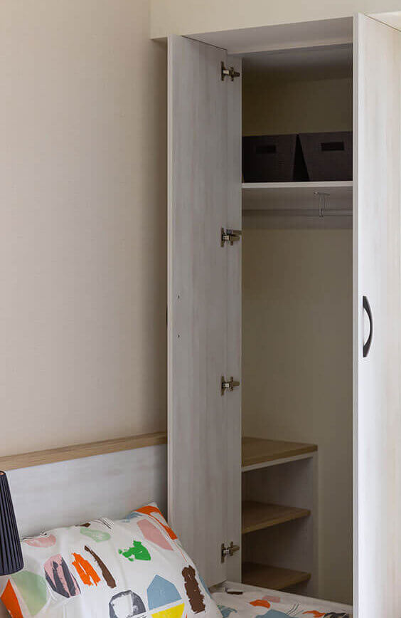 轉角柱後面形成了凹深的畸零空間,經轉化設計為棉被收納櫃,點石成金好利用。