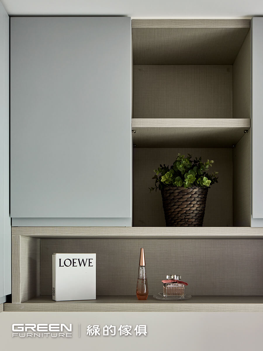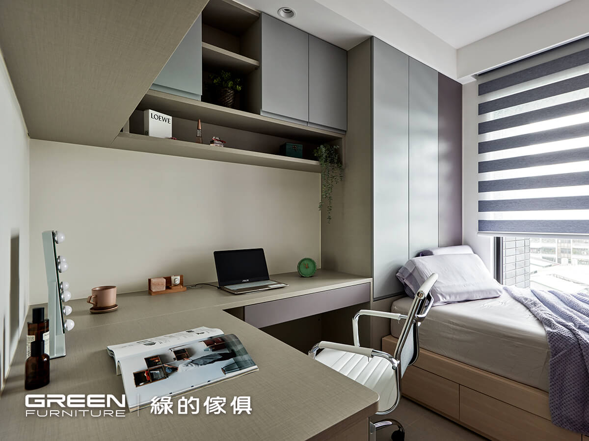 透過系統傢俱的高度客製,綠的傢俱將收納與美感完美融合,讓這間青少年房設計不只是一個睡覺的地方,而是真正能陪伴女孩成長、學習、放鬆的生活場域。即使是小坪數空間,也能藉由精緻的設計與材質選用,形塑出個人專屬的風格天地。