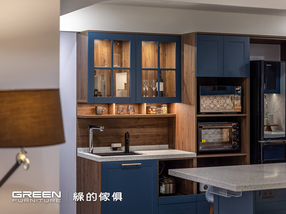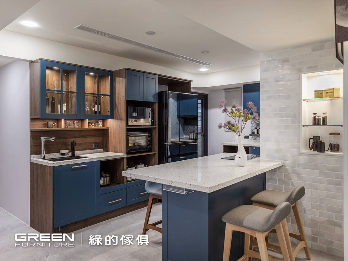 為了讓格局更具開放感,將原有封閉式廚房敞開,餐廳空間以石英石中島為核心,結合IH爐與花崗岩水槽,成為家中備餐與用餐的多功能區域。中島下方設有完整收納空間,延續餐櫃與展示櫃設計,並使用尊爵藍胡桃木色系統板,穩定整體視覺風格。