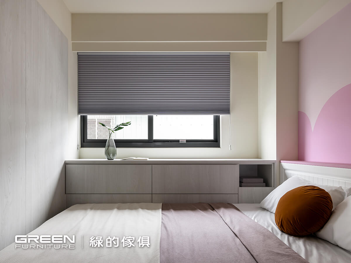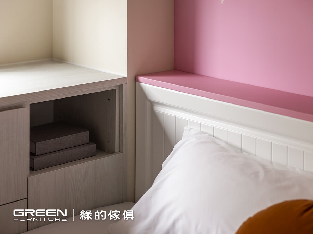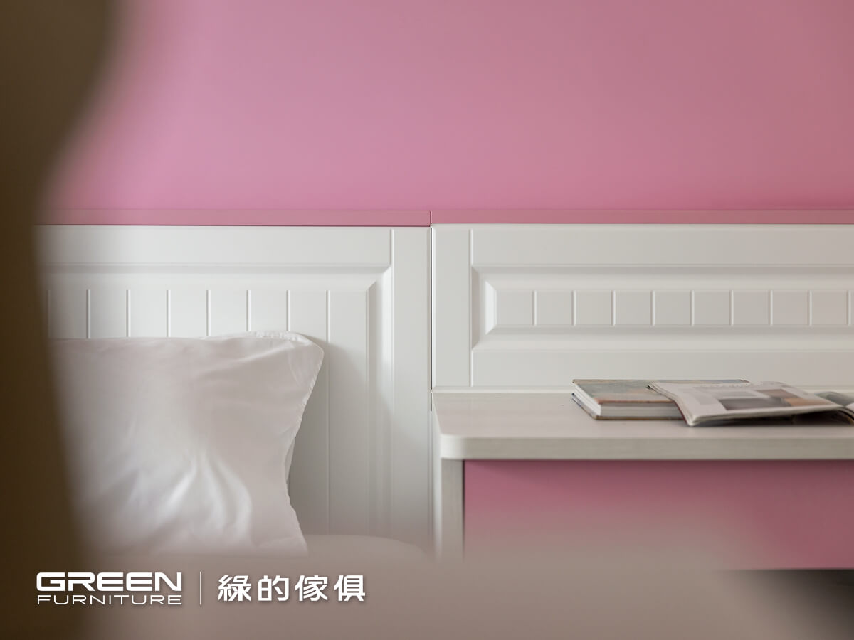 女兒房間是特定的粉紅色,牆面是設計師以粉紅跳色繪製的,床邊以白色陶瓷烤漆系統板材帶來英式鄉村風的質感。衣櫃以英式鄉村風線板與榆木兩種系統板材打造,搭配銀色雕花把手,上方也以英式鄉村風系統線板修飾,猶似公主的小城堡。