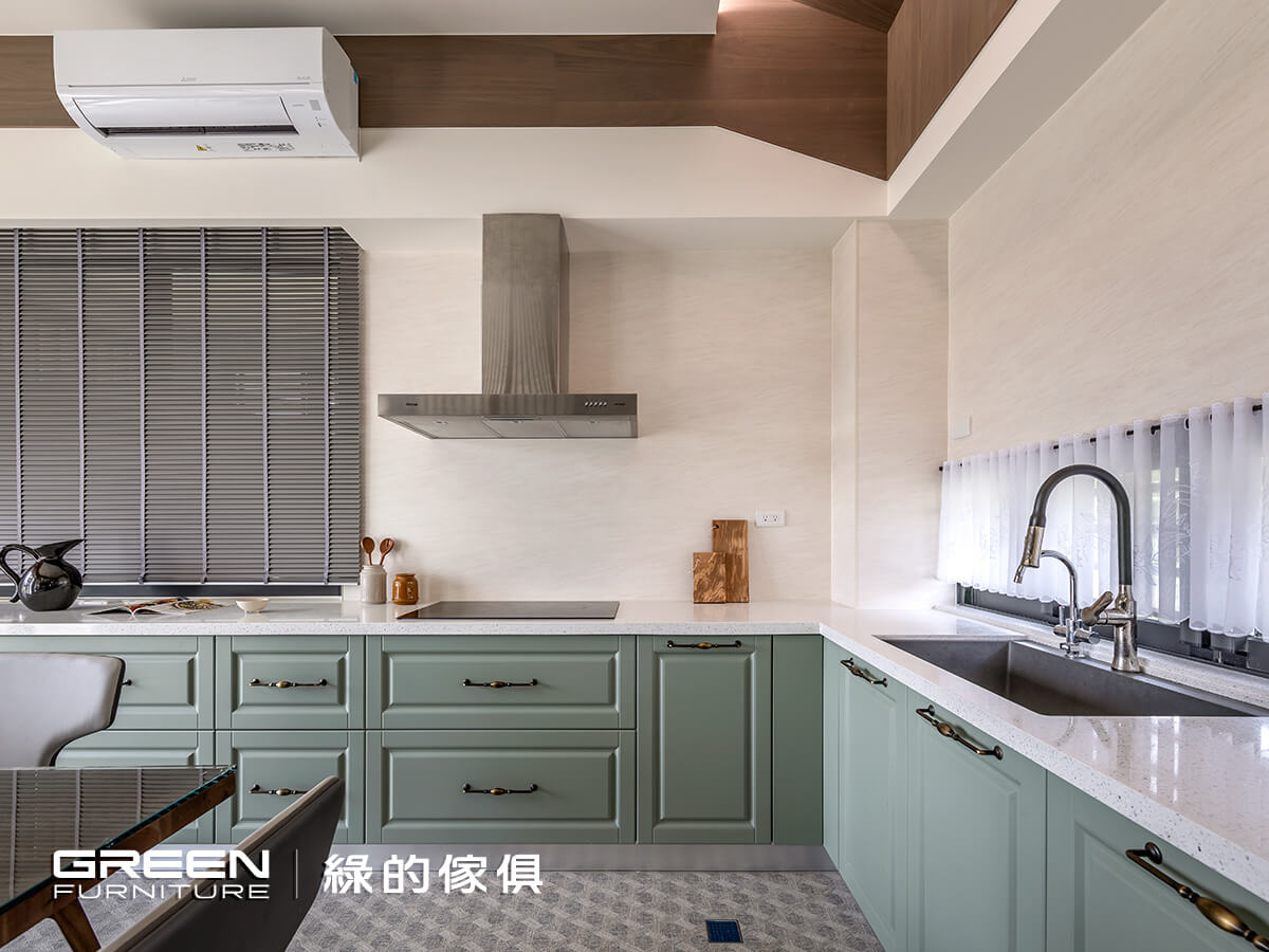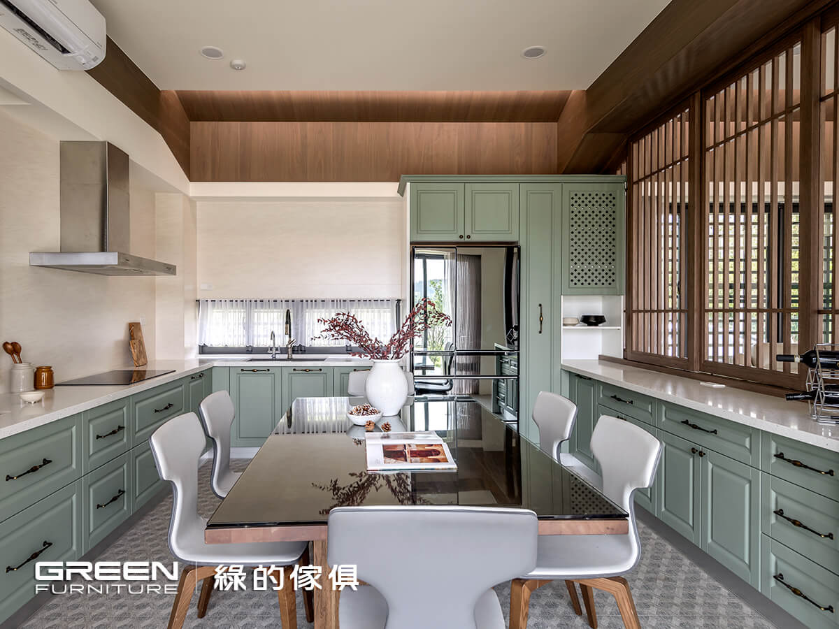 彼此相依的餐廚空間,將餐桌視作軸心,並依循格局砌築ㄇ字型廚房,創造全方位且流暢的回字形動線,同步嚴選陶烤鄉村風的「秋谷綠」系統板材,憑藉量身定制的優勢,將爐檯、水槽、冰箱與收納機能揉合其中,符合作業動線,也能維持簡潔俐落的畫面。針對細節方面,以灰綠色調呼應窗外的自然光景,而嚴謹的九道烤漆工序,亦可使門板易於清潔維護,不用擔心沾染油垢污漬,在美感機能之間取得恰好平衡,成就美好的料理儀式。