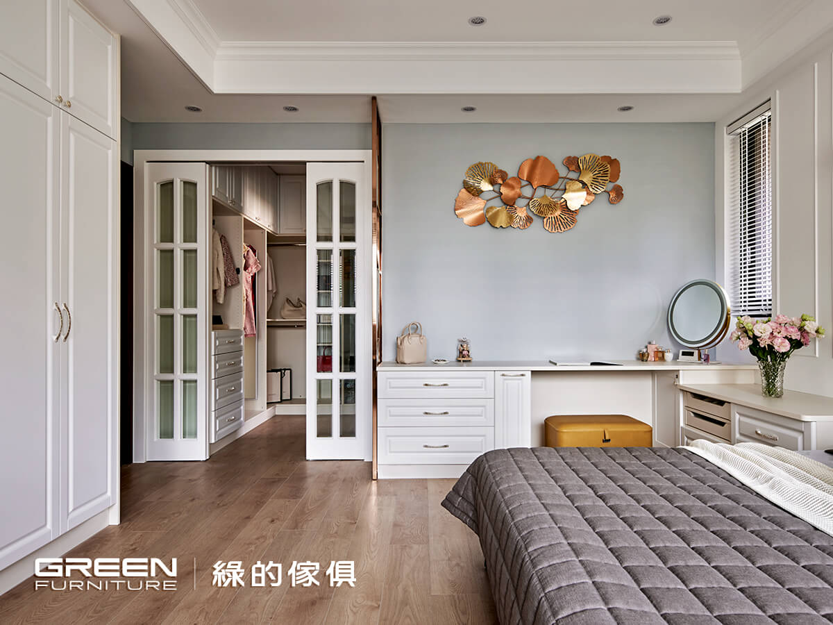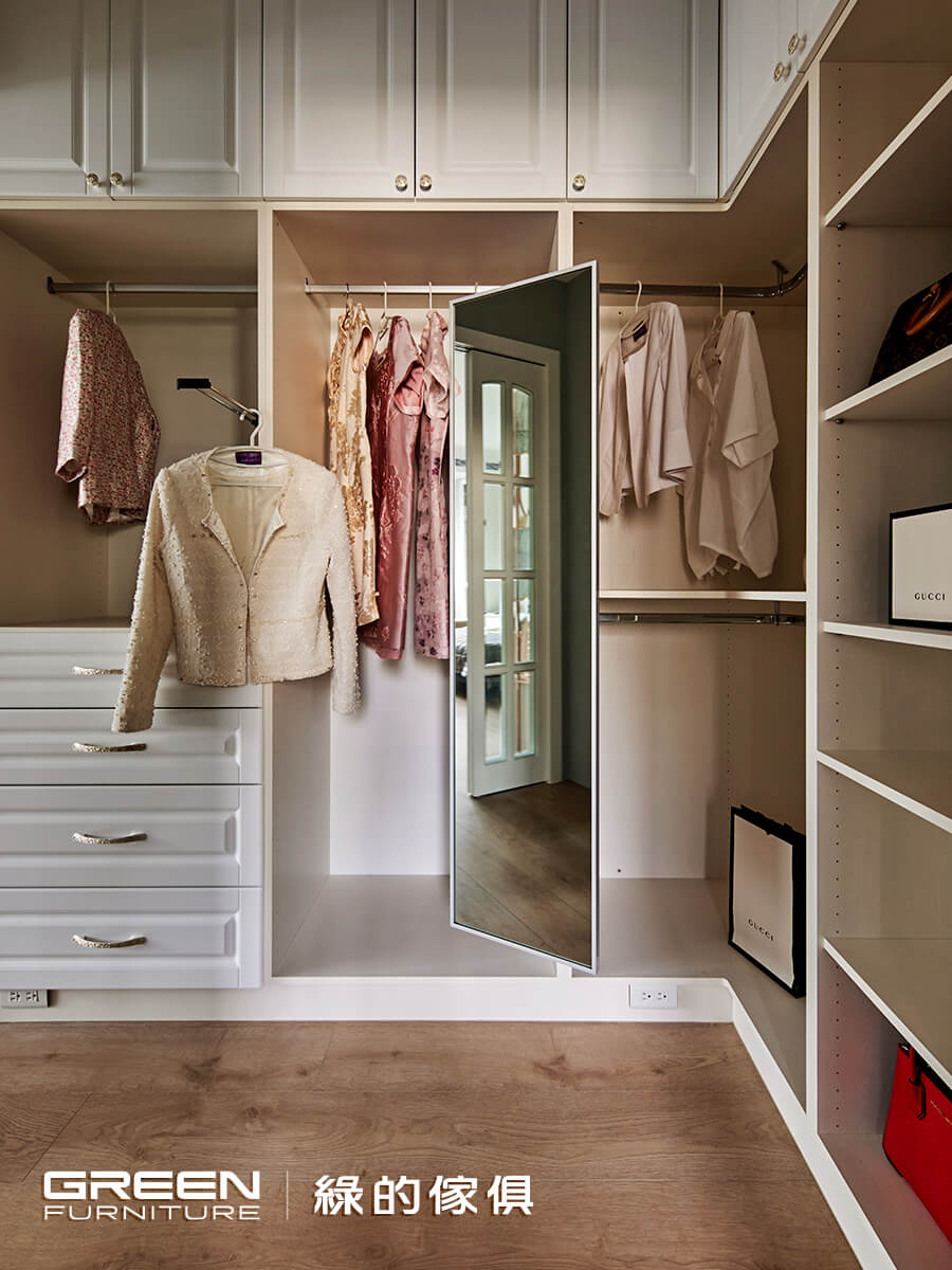 設計師將主臥旁打造成更衣間,透明拉門搭配開放式衣櫃更顯空間穿透與高級感,L型到頂天衣櫃,讓四季衣物及配件都能擺放,免去了換季的煩惱,設置旋轉穿衣鏡每日出門前都能配搭服飾,更方便女主人的日常打扮。