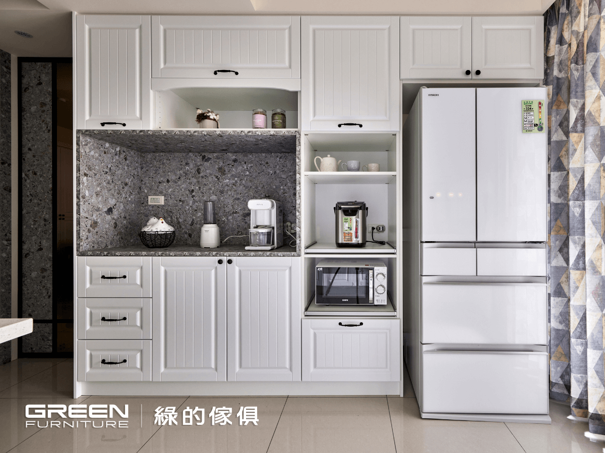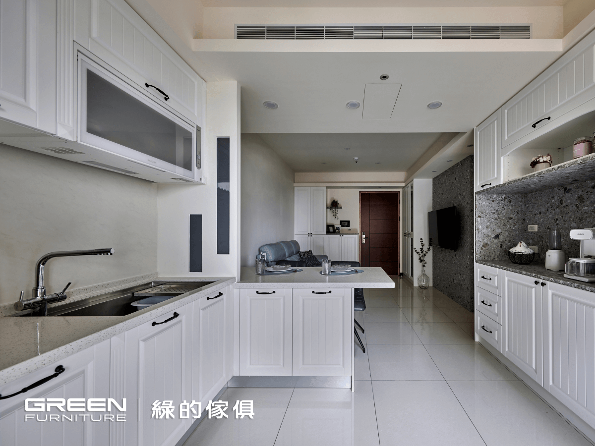 輕落一道中島吧檯,成為公領域的柔性介質,無形擴闊空間尺度,闢出自在舒心的餐敘境地,但將時序倒轉,其實過程一點也不簡單,高先生無奈表示,當初剛好錯過客變時期,只能將原本不合宜的廚房重新改造,所幸,綠的傢俱團隊憑藉專業經驗,根據實際生活情況縝密調配,使餐廚空間煥然新生。