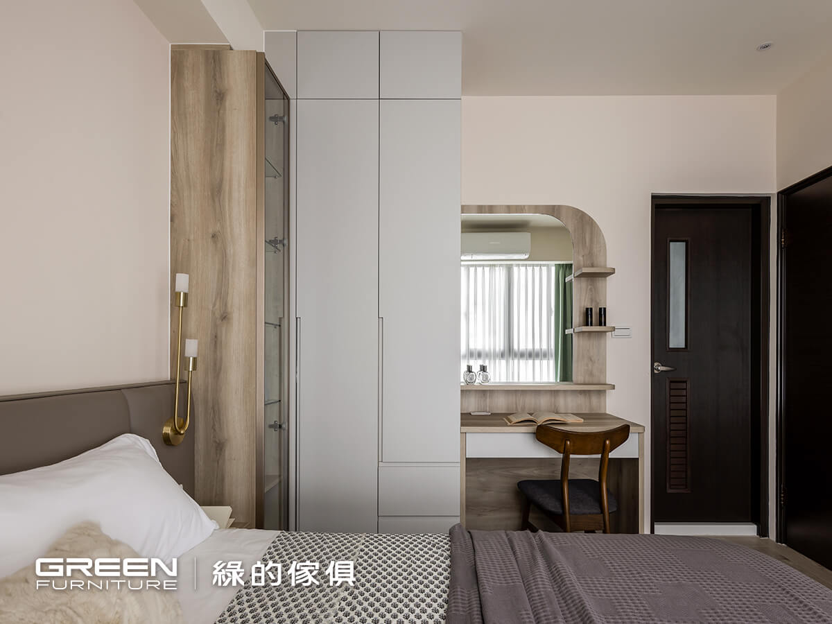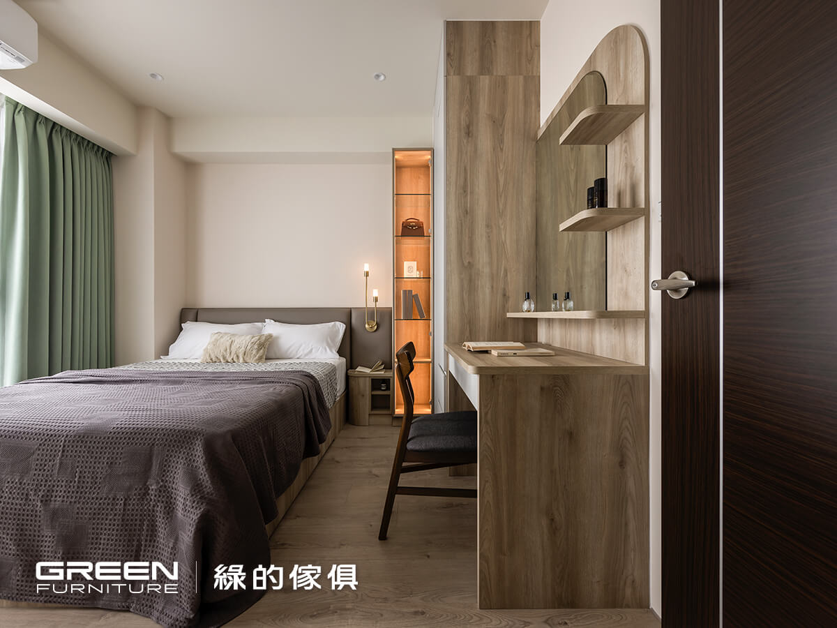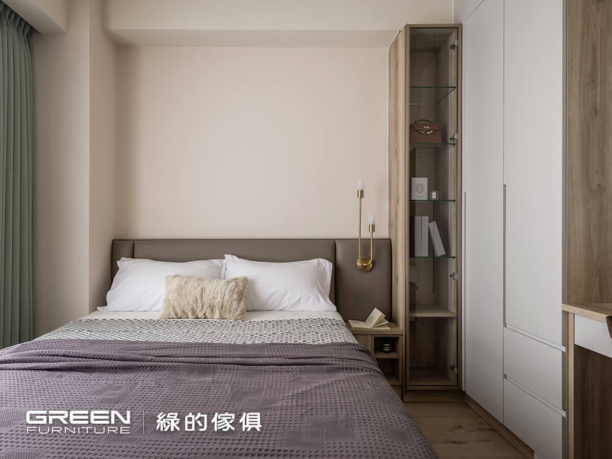 系統櫃設計師 台中松竹店-王瓊茹 理想家設計師 李姿潔主人家的基本資料 地區 台中市豐原區 屋齡 新屋 室內坪數 (獨棟透天)100坪 格局 6房4廳 居住人數 6人設計巧思長輩房規劃選用奶橡色系統板材,搭配羊絨皮革面板的系統櫃,營造出溫潤質感與舒適氛圍。媽媽親自挑選的綠色窗簾,更為空間增添一抹清新氣息,讓整個房間洋溢著放鬆與愜意。玻璃系統櫃與特製圓弧系統櫃,不僅提供充足的儲物空間,還豐富了室內視覺層次,並兼顧長輩房的安全性。整體長輩房規劃結合了實用性與設計感,打造出既舒適又符合需求的理想居住環境。延伸閱讀:臥室設計不可不知3大技巧=================「綠的傢俱」訂製您的專屬居家風格到府丈量:實體/雲端雙門市諮詢雙師諮詢服務:系統櫃設計師與室內設計師服務項目:整室規劃/室內設計/系統傢俱/系統櫥櫃預約諮詢服務 > 請點選 全省門市資訊 > 請點選