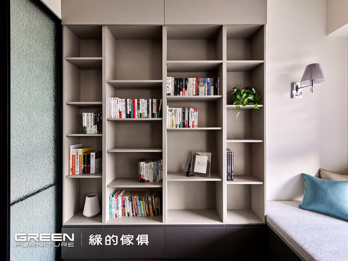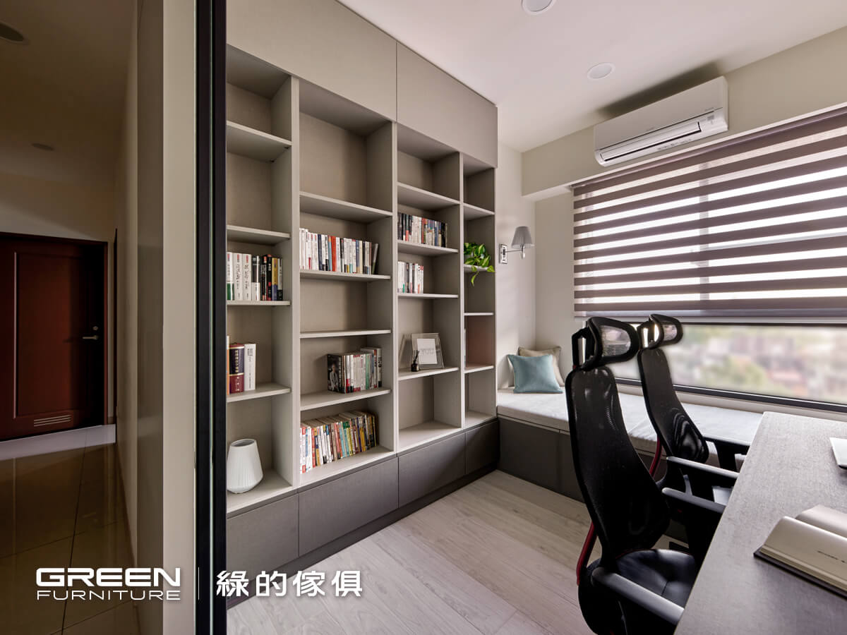 卸下實牆、釋放視線,以穿透玻璃模糊客廳與書房的界線,一筆連袂起的窗景,將日光效能極大化,亦可使心境頓時豁然開朗,依序憑藉系統傢俱量身訂製的優勢,貼合格局尺度砌築寬敞工作桌,使卷宗文件平整攤開,同步沿窗設置臥榻,裁定單人床尺度,即可使書房切換成客房,以多功能防概念大幅提升機能性。