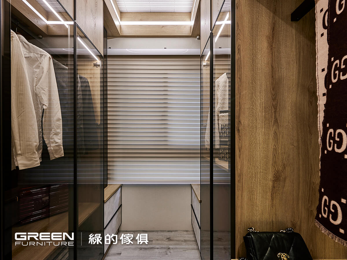 更衣室內部則結合開放式與封閉式兩種收納機能,針對小坪數空間,我們精心設計小更衣間也能擁有大容量收納。轉角處安裝開放式吊衣桿,讓屋主可隨手掛放常穿外套與包包,方便又實用;衣櫃門片局部選用清茶玻材質,具備良好透視感與防塵效果,能輕鬆辨識收納內容,節省尋找衣物的時間,亦維持空間整潔有序。