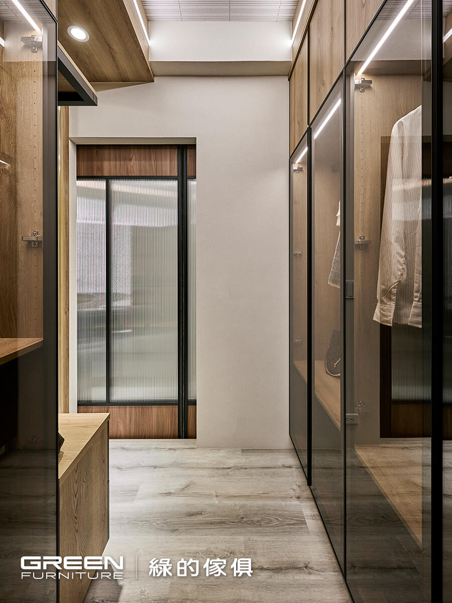 以長虹玻璃拉門作為空間界定,是更衣室規劃中的一大亮點。長虹玻璃兼具透光與遮蔽的特性,在劃分區域的同時,也讓空氣與光線得以自然流通,有效提升整體居住空間的明亮感與通透性,適合現代家庭講究「開放式與隱私感兼備」的需求。