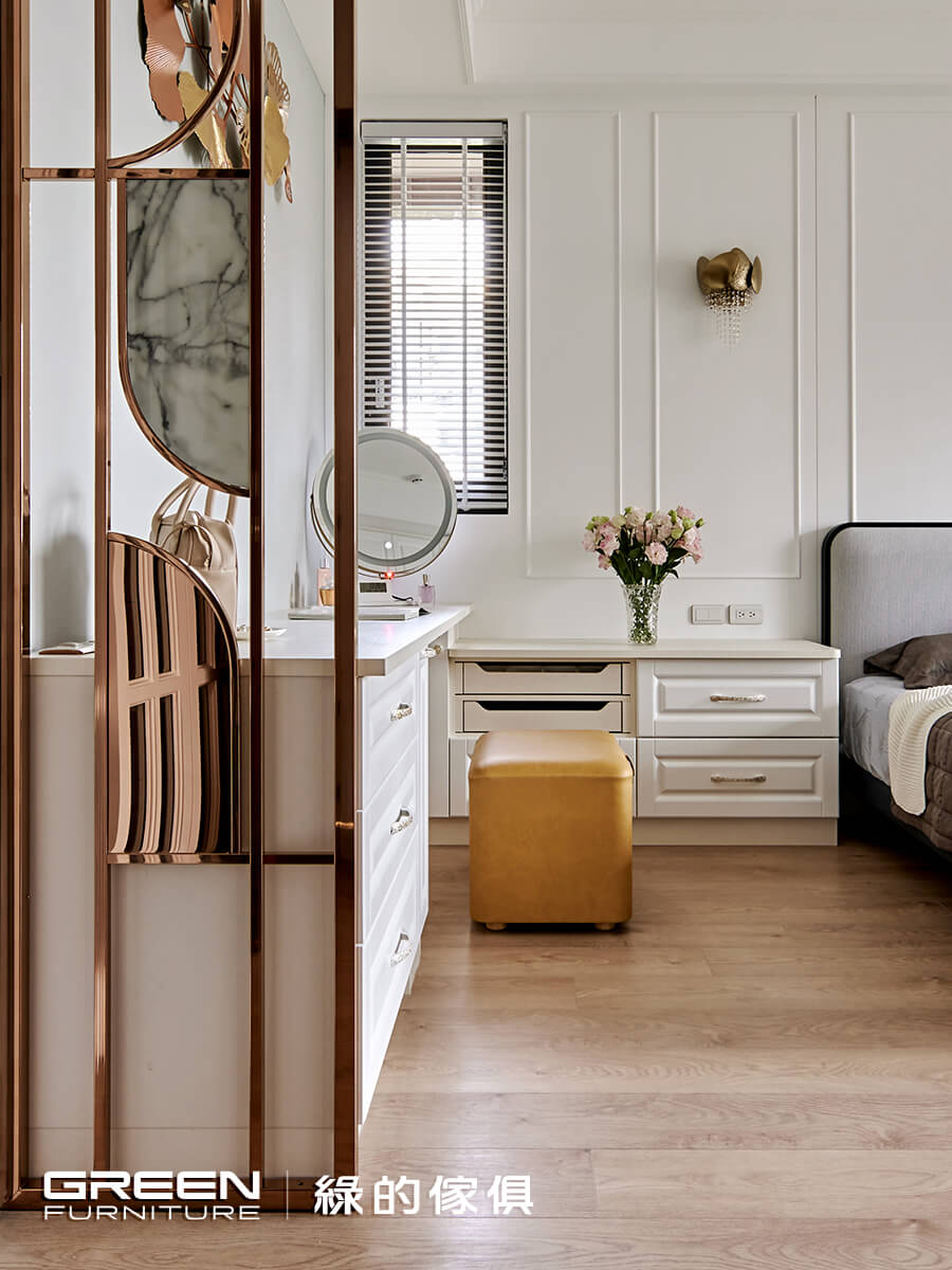 入門即讓視覺感知到高級的細膩,玫瑰金線條屏風與大理石紋的疊加,彰顯品質與格調,空間在白與藍的包裹中,色調溫和與富有肌理的鄉村風門片,盡享生活中的每一刻溫柔;內崁式的電視櫃結合衣櫃一路延伸至臥榻,既省空間也解決儲物難題。