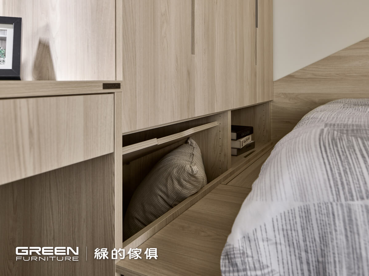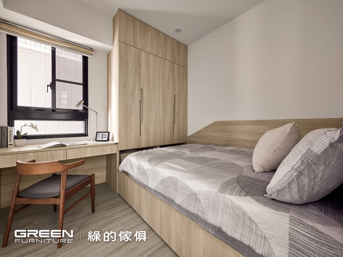 臥室內有梁柱容易產生壓迫感更會破壞視覺美觀,設計師使用系統衣櫥巧搭樑柱下的空間,擴增衣櫃收納機能的同時也解決梁柱問題,進門右手邊的系統衣櫥更延伸出書桌,達到一致性的美感,完善整個格局規劃;在沁白與白詮兩種呈色自然、清新的木紋之下,鋪陳出溫暖的調性,使整體感受更放鬆無壓。