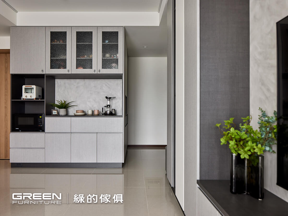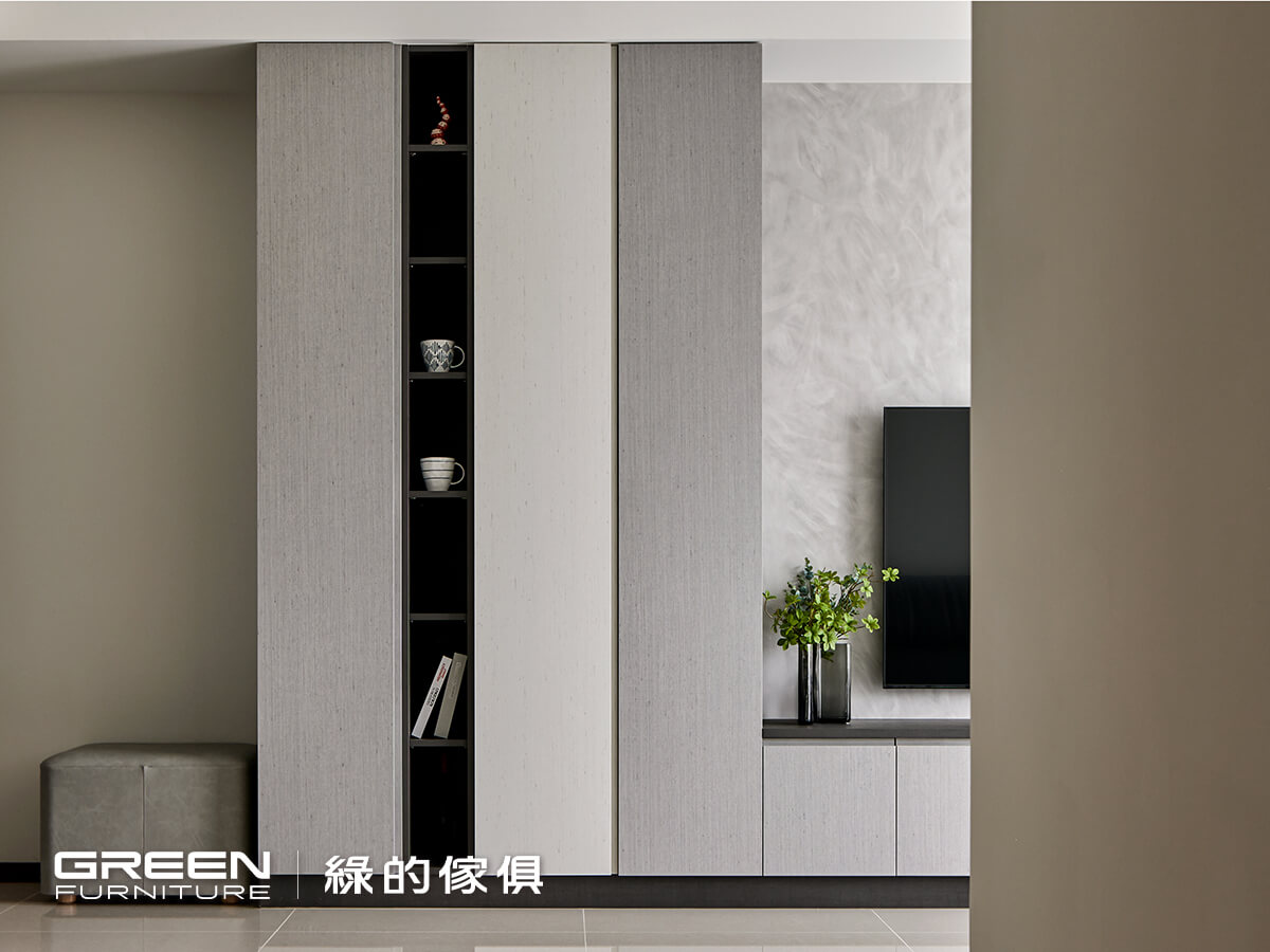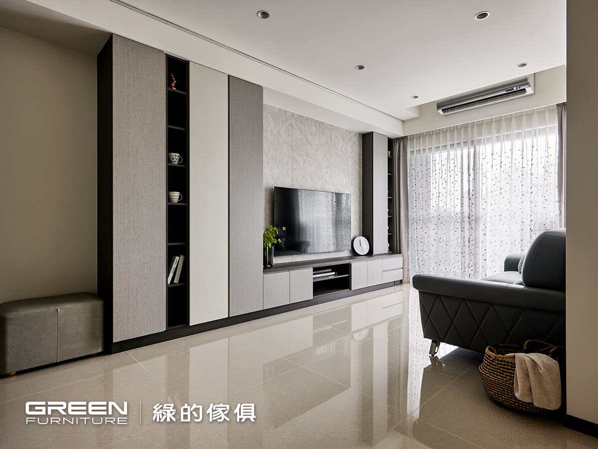 下方系統電視櫃同樣呼應牆面配色,以簡約線條與收納功能融合,展現出「綠的傢俱」專業打造系統傢俱的設計功力。雖然坪數有限,但透過整合主牆與收納的設計策略,讓小宅也能擁有舒適、實用又不失風格的生活場景。
