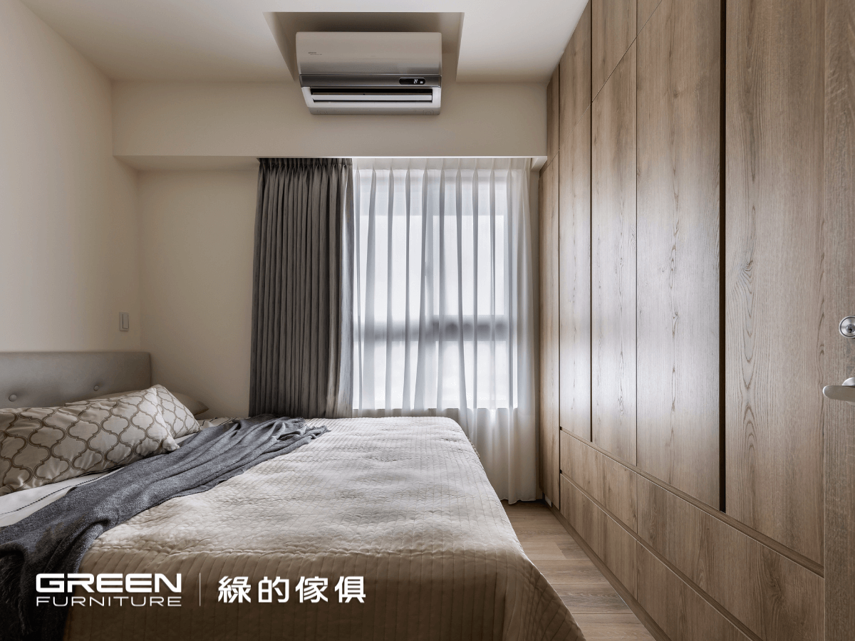 當走進主臥室,有別於公領域的古典鄉村調性,一派自然溫暖氣息瞬間襲來,正是源自於女主人傾心於實木的紋理與質感。全室以「核橡」系統板材當作基調,從衣櫃開始,採取頂天立地的設計手法,憑藉疊櫃向上爭取收納空間,使換季衣物或生活雜物妥善存放,不浪擲分毫。