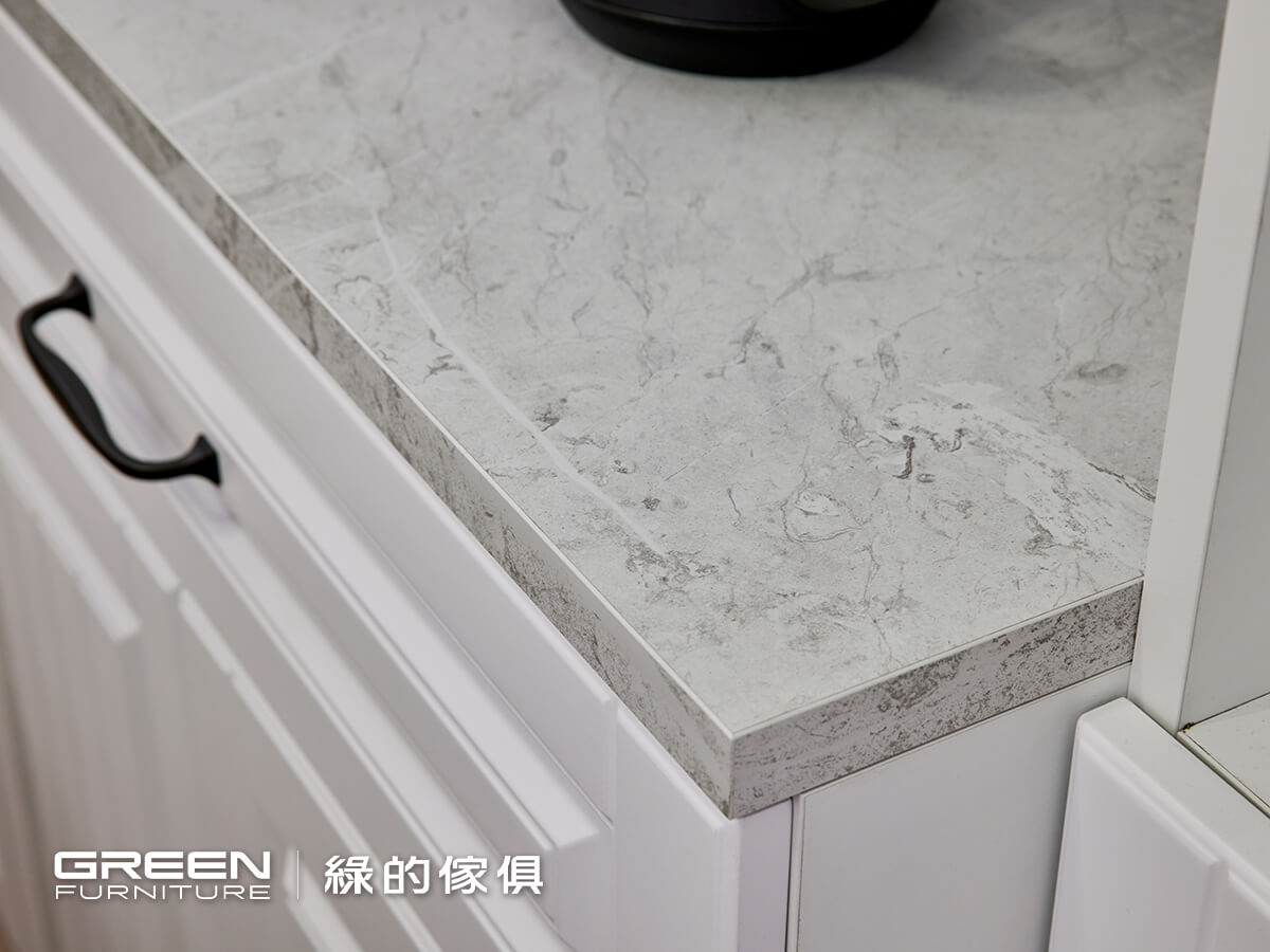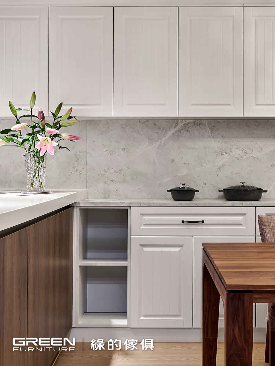 轉身望向餐廳,一幕彷彿出自歐美雜誌的優雅畫面立刻展現眼前。綠的傢俱團隊延續整體鄉村風格的設計語彙,搭配經典線板造型與格子窗元素,運用溫潤木色與自然紋理,打造出樸實中見細節的用餐氛圍。原本突兀的中島吧檯,也在整體室內設計的整合下自然融入,成為串聯餐廚的實用亮點。更重要的是,設計師特別規劃出展示區,將女主人珍藏的瓷器完美陳列,成為全家目光的焦點,不僅讓物件被好好珍惜,也讓生活多了一份儀式感。這樣的系統傢俱設計不只是美觀,更兼顧收納與實用,真正將風格與機能完美平衡。對喜愛鄉村風格、又重視生活細節的屋主來說,綠的傢俱提供的不只是裝潢,而是一種貼近理想生活的實踐方式