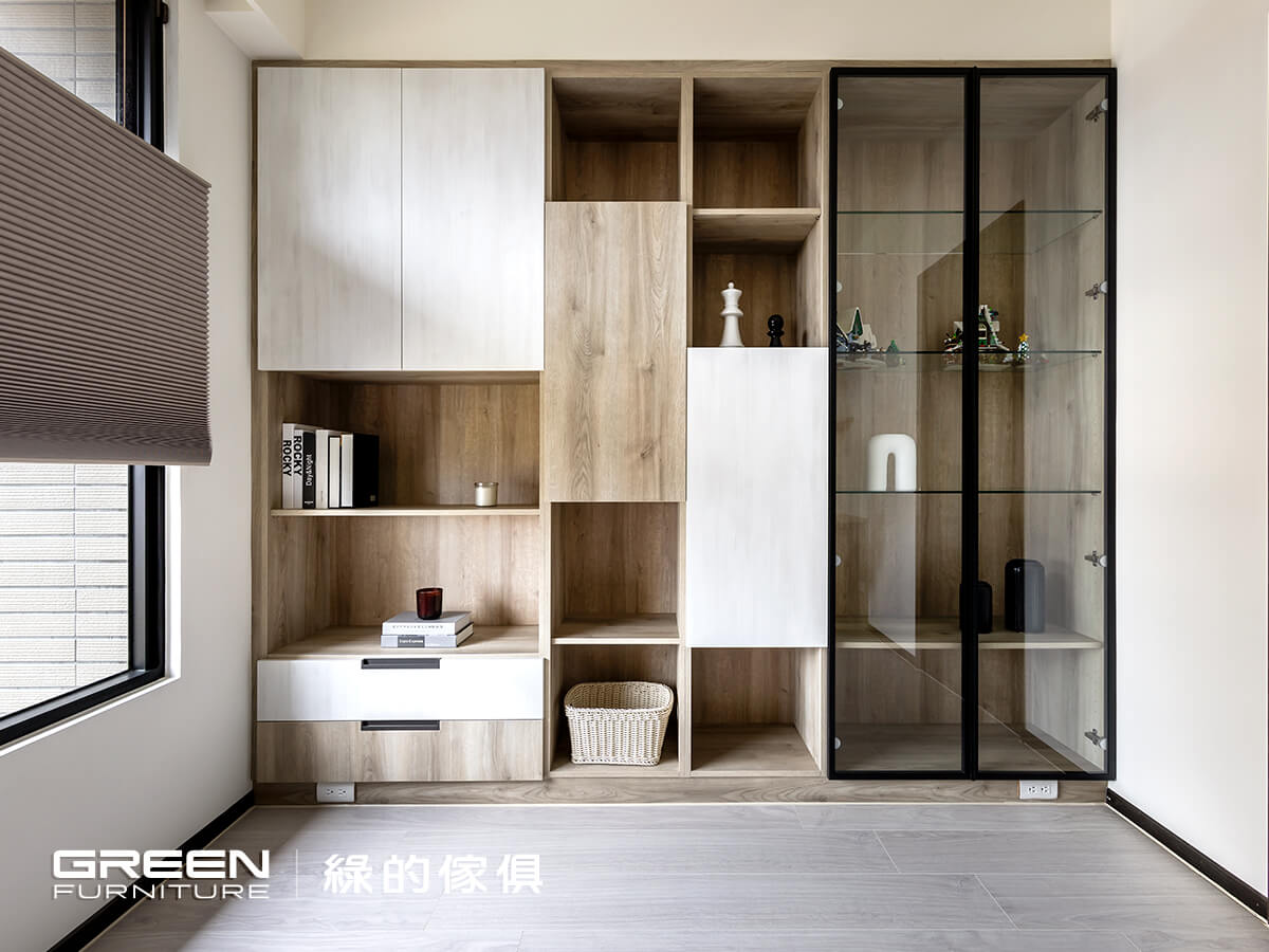 除了展示機能外,整體書房設計十分講究收納視覺層次。書桌牆面打造錯落書櫃設計融合三種不同收納機能:封閉系統櫃、開放架、玻璃展示完美滿足日常收納、展示防塵需求,實用性設計兼備。