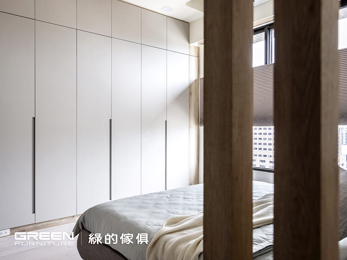 入口床頭處的細版木格柵,是創造臥室隱密感的細緻設計。整面衣櫃帶來了充分收納,交錯無把手設計的亞麻灰門片;日常物品都能收得整齊有序,為空間增添簡潔俐落。