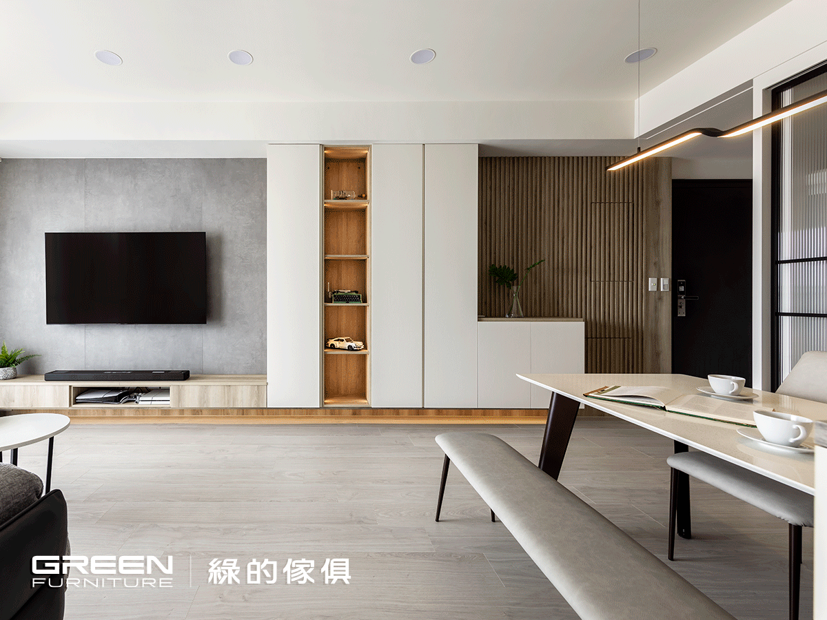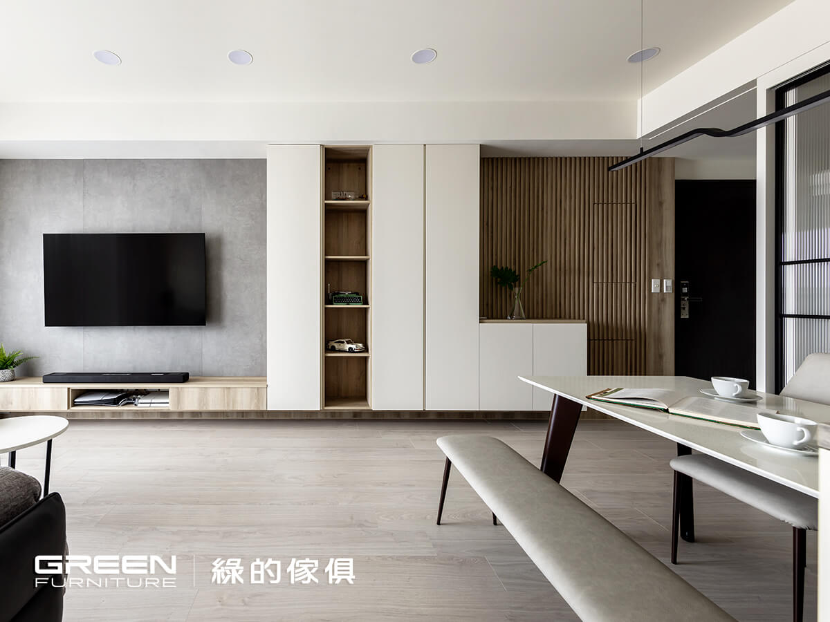 身為醫生的屋主重視健康,一開始就對綠的傢俱的環保板材印象深刻,也是決定合作的原因之一;門市現場更有多種風格、材質和色調選擇,讓對美感很有想法的屋主能夠,在三房兩廳的裝潢設計當中選出最喜愛的和諧搭配。