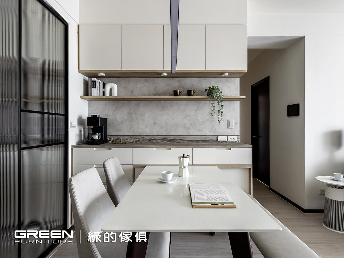 面板淡雅的「鑼帛質感系統板材搭配質地細膩琥珀原色」系統板材檯面以及微帶雲彩白」作為系統餐櫃背牆呈現多層空間表情,賦予空間自然溫潤氣息。這樣色系材質搭配,不僅提升整體空間質感,呼應整體室內設計風格和諧性。