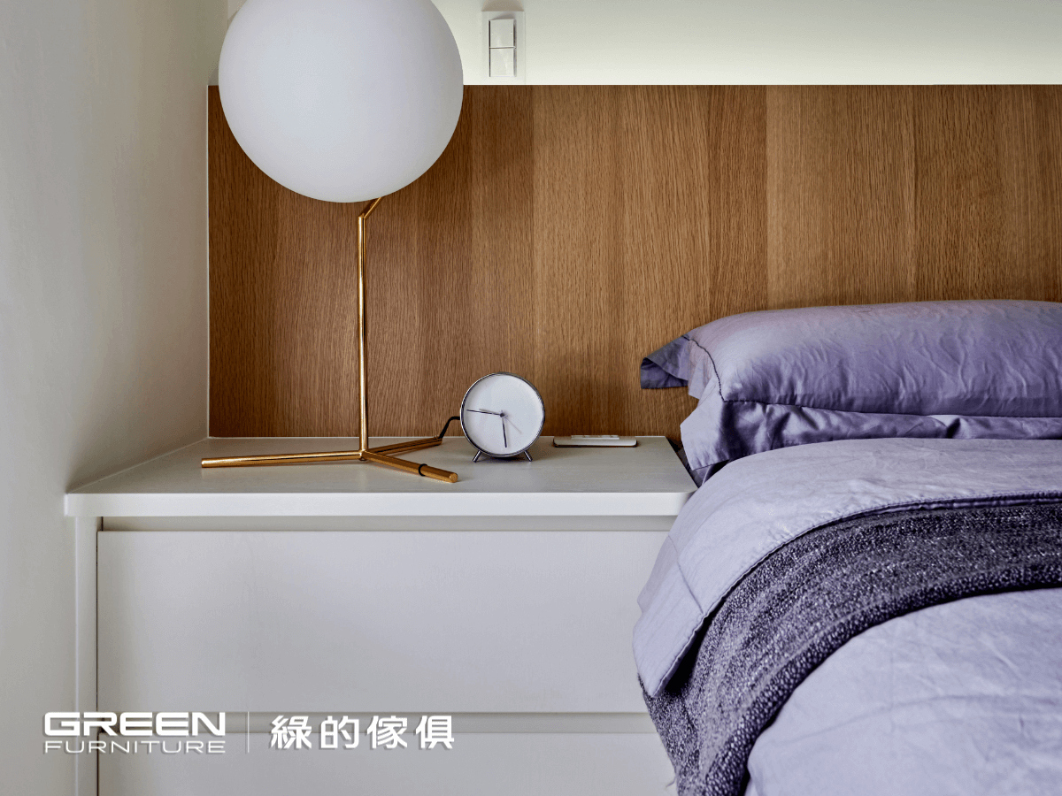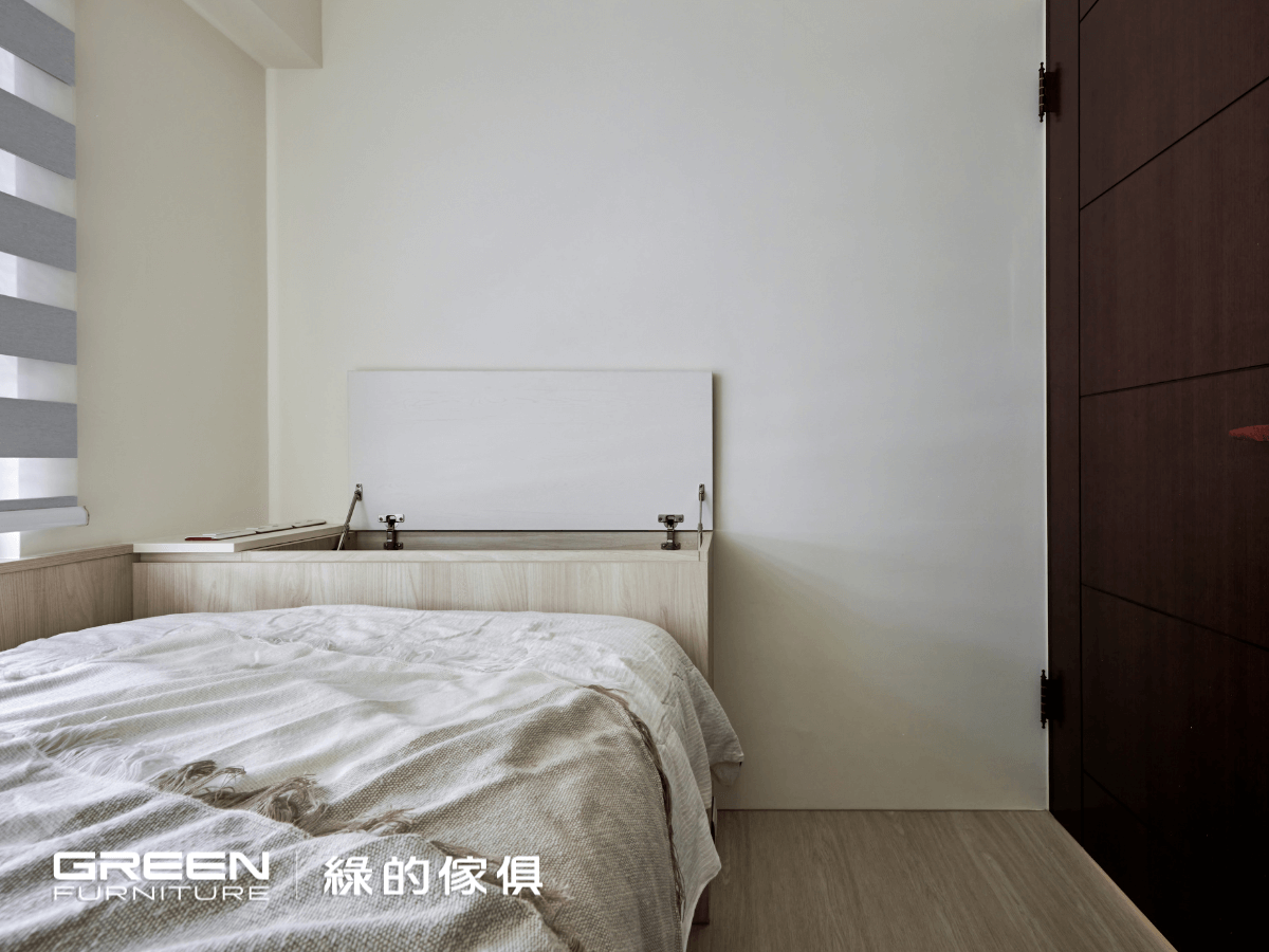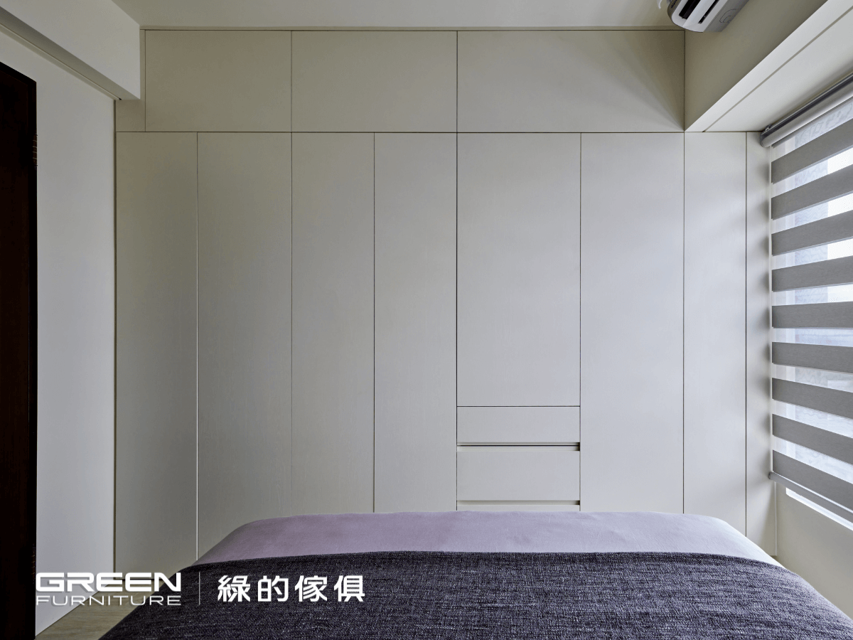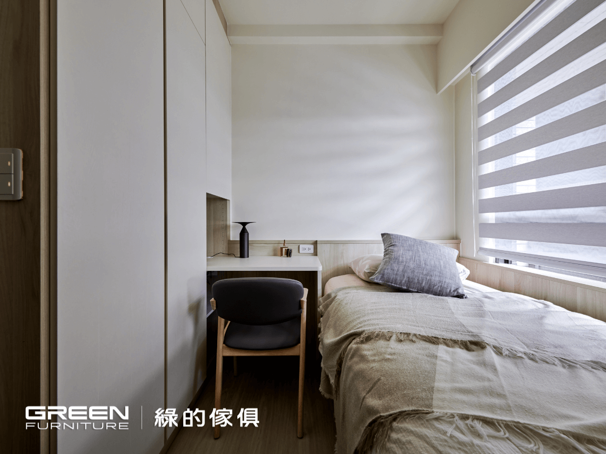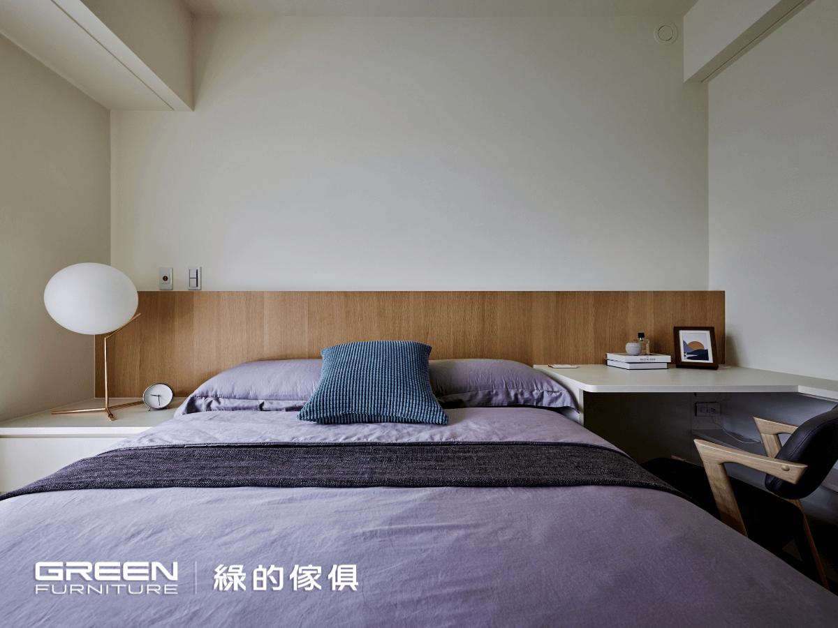 主臥延續全室主調,使用『 植橡 』與『 鑼帛 』兩種系統板材打造質感溫潤的空間氛圍。櫃門皆採用特殊鉸鏈設計,可大角度開闔,優化使用動線,展現綠的傢俱在小坪數裝修中對細節的高度重視。搭配無把手的平整櫥櫃,讓整體室內設計視覺俐落、線條乾淨。