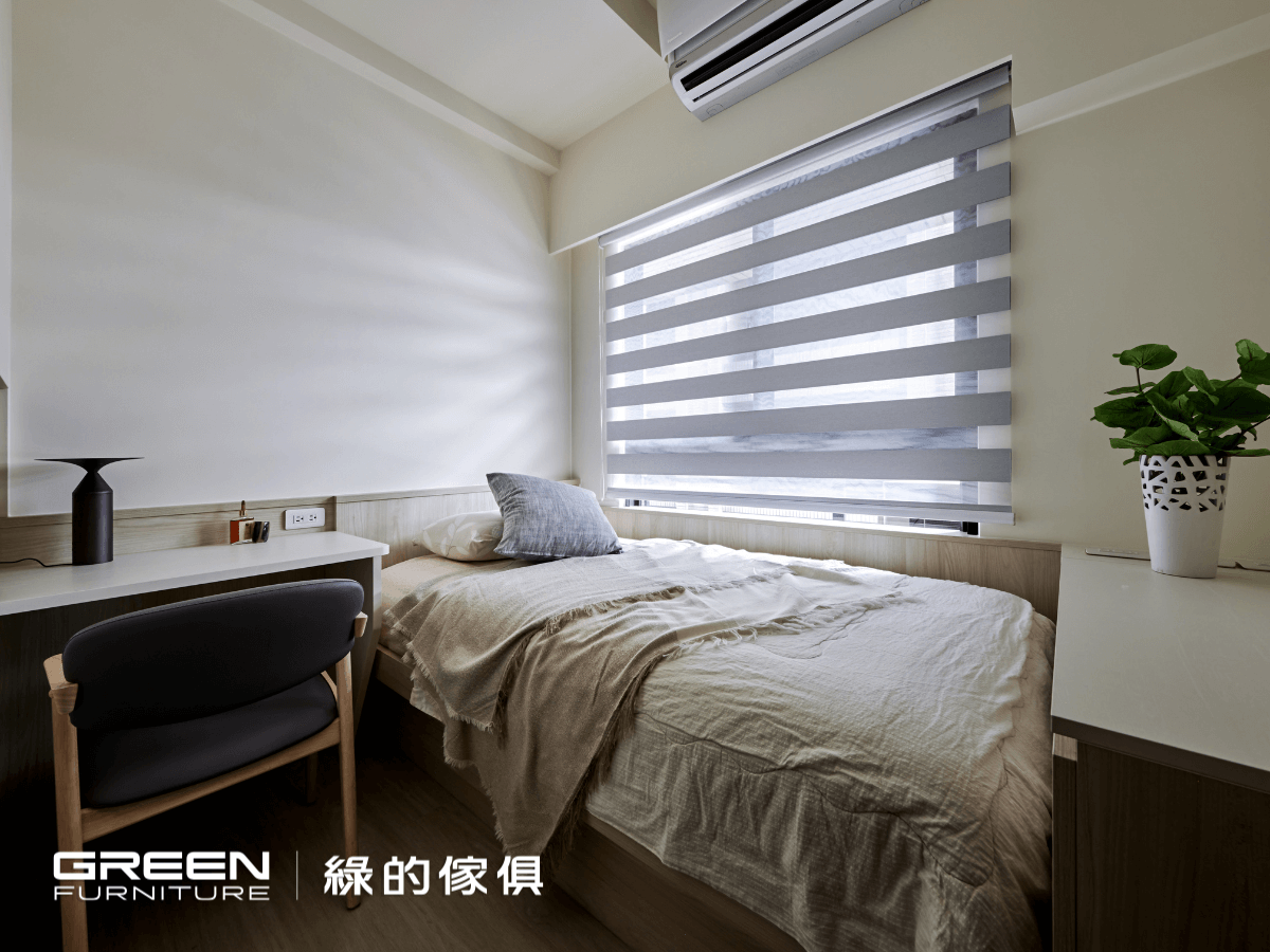 沙發後方規劃為半開放書房,利用架高木地板與系統板組構的半隔間牆,同時成為沙發背牆與書桌支撐。這樣的系統櫃設計兼具實用與美感,展現出綠的傢俱在整合多功能空間上的專業能力。臥榻下方的『 植橡 』系統板材打造的淺櫃與後方簍空書櫃,則延續整體收納美學,以隱藏式門片提升視覺簡約度。