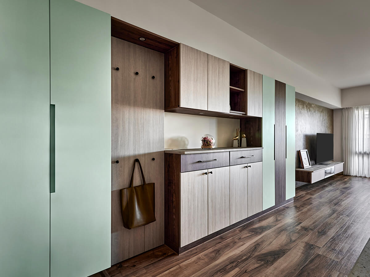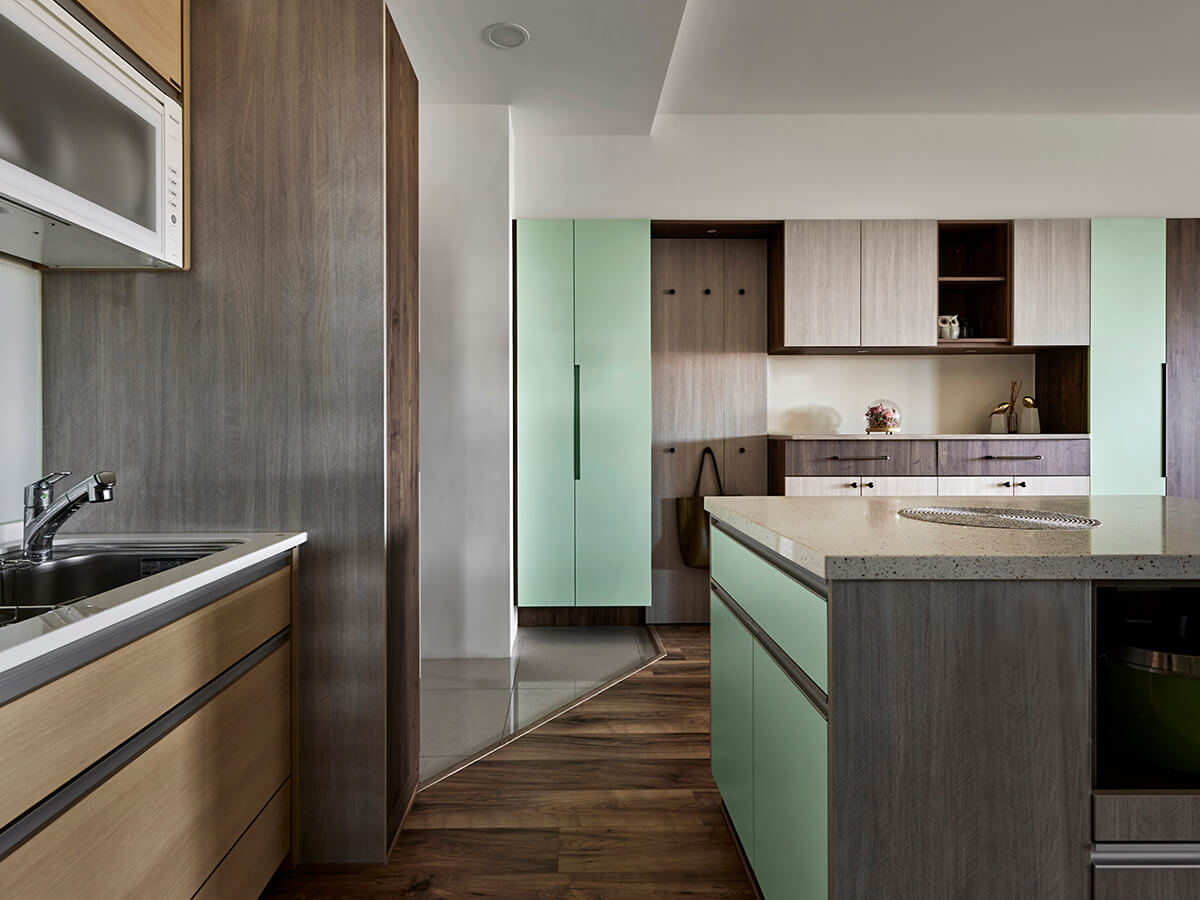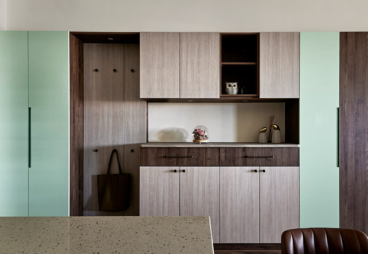 緊鄰玄關的收納櫃,上下櫃體同樣以胡桃木與日本羽毛木搭配,加上生意盎然的琥珀原色檯面,一旁則是落地的純綠與胡桃木交替的收納櫃。