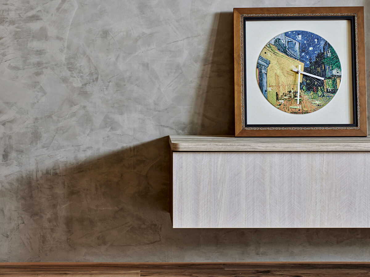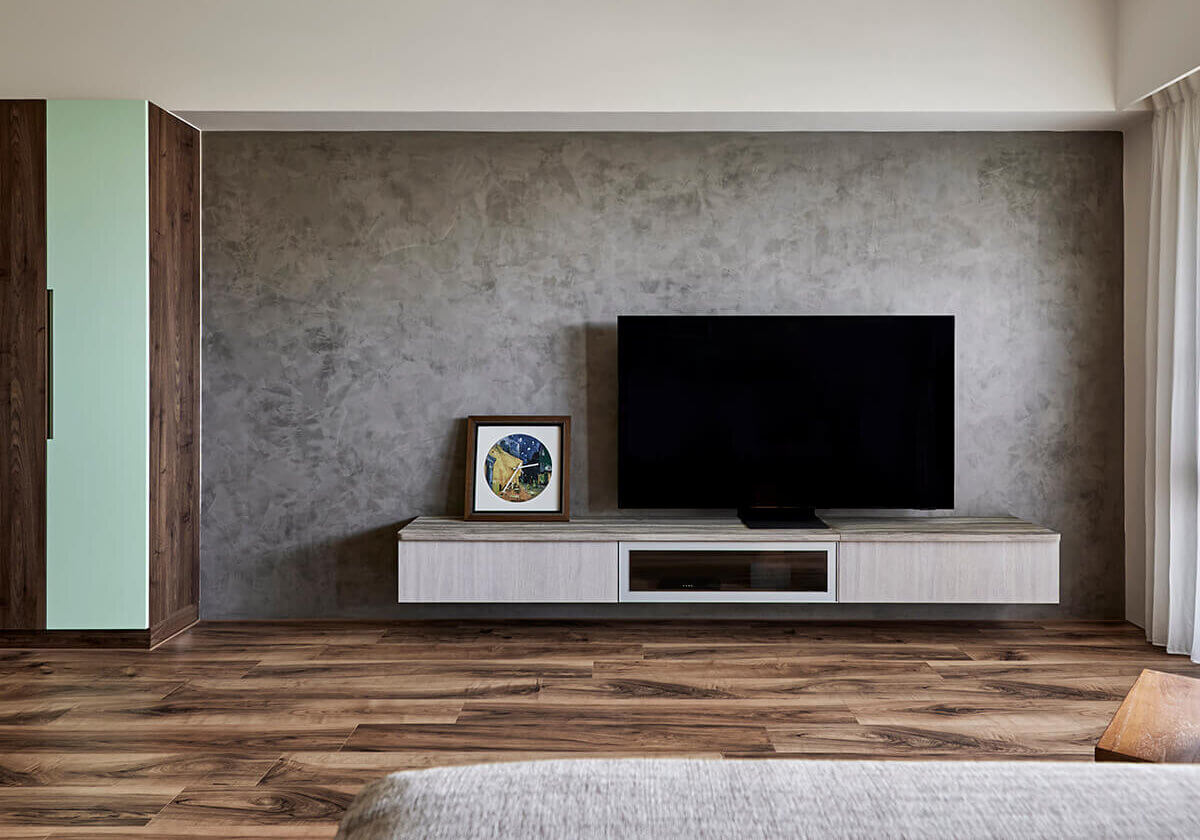 客廳主題牆是屋主林先生與兒子,用了半天的時間,使用特殊漆合力完成的作品。波浪般的紋路在牆上恣意飛舞,沿著窗光堆疊蔓延。下方的懸吊式電視櫃也以琥珀原色搭配日本羽毛木,與牆面的色調默契十足。