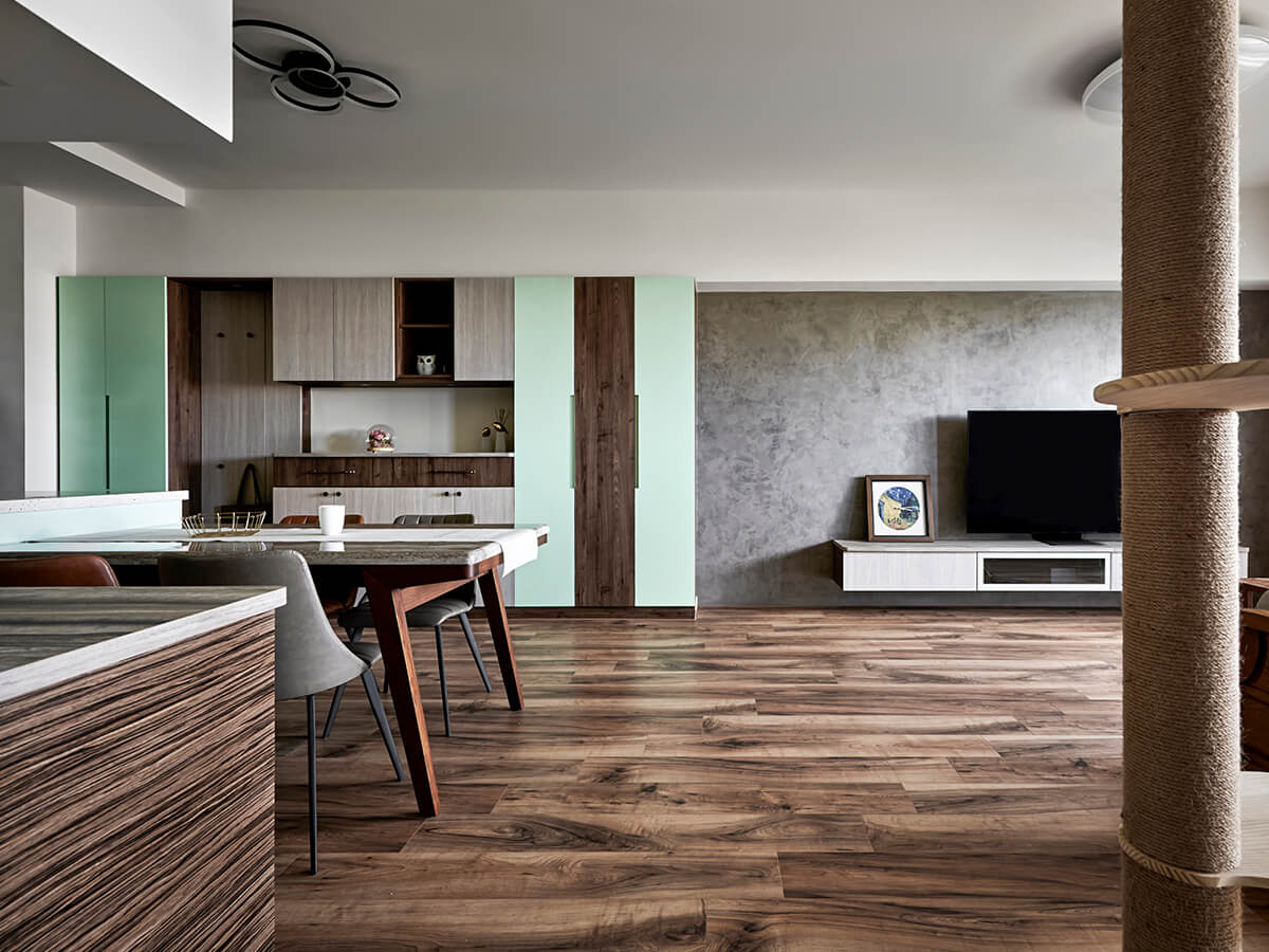 屋主林太太喜歡大自然的氛圍,讓她有安心的感覺。她笑稱自己從小在山上長大,是個無法抗拒木節的人。雖然是林先生找上「綠的傢俱」,但林太太對山居歲月的喜好,很難不復刻在新居裡。她也喜歡大膽、明亮的色澤,讓設計師更放心地與空間的規劃連結。偶來的不經意跳色,挾帶著木質板材間的層次碰撞,這是大隱隱於都會裡的世外桃源。