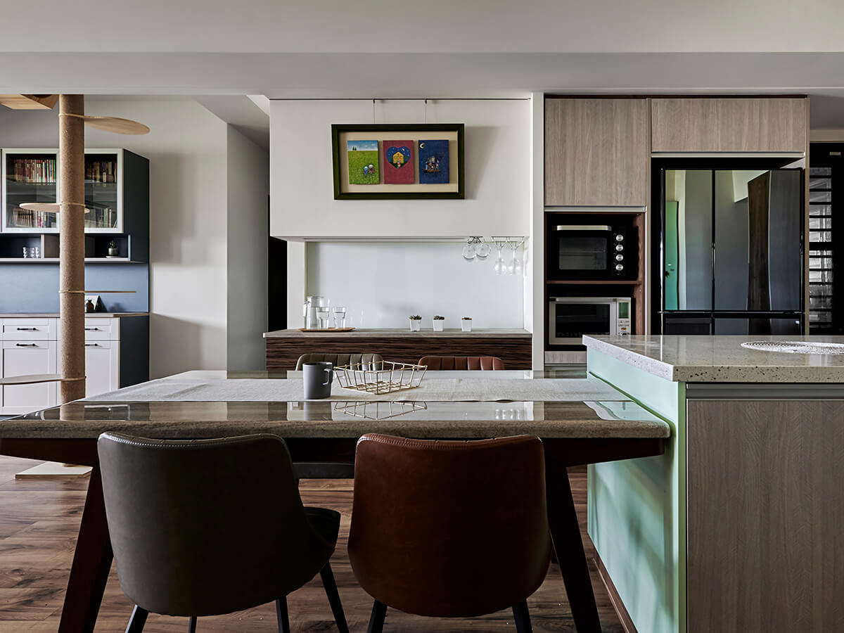 佇立在餐廳裡的那座小坪數中島,很難讓人移開視線。這座小坪數中島,每一面都有其功能 補足廚房儲藏空間的不足。三面使用的中島,以石英石為檯面,三側櫃體各有其不同的儲藏功能。