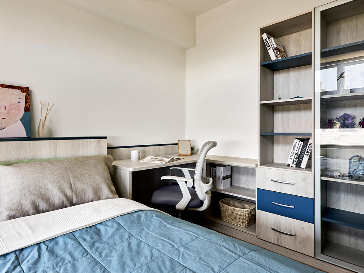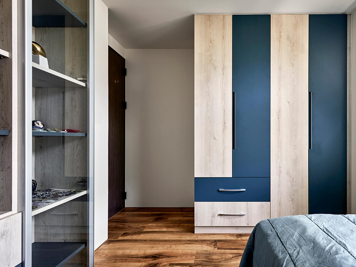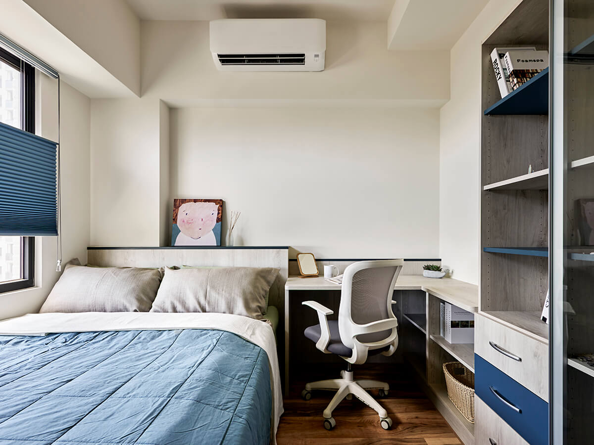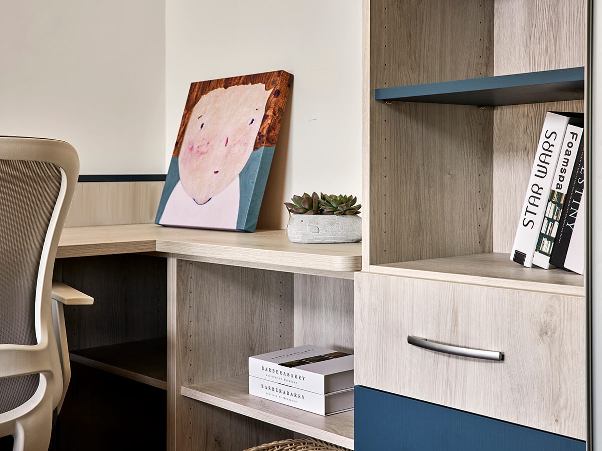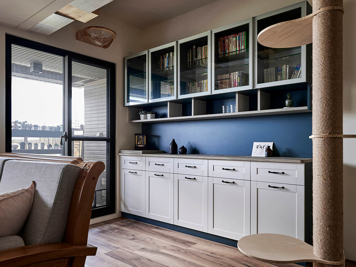 客臥外面深邃的波布藍,是佇立一隅的書櫃。波布藍的櫃體,搭配日本羽毛木的隔板、琥珀原色的檯面與白色烤漆的門板,還有上方的鋁框透明櫃,不同的櫃體組合,更讓這座書櫃展現謎樣風情。