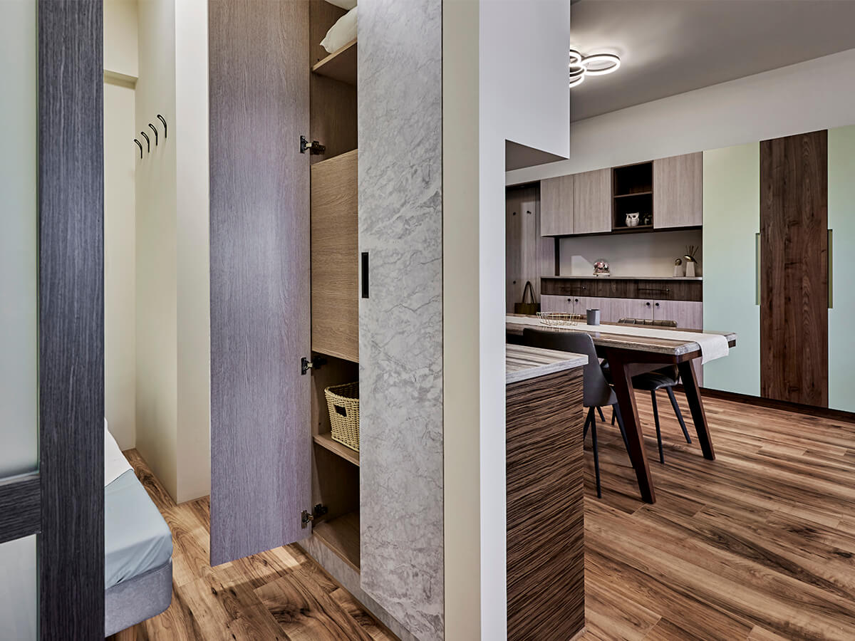 一旁與玄關櫃同款日本羽毛木打造的那面木牆令人好奇,原來它是為了包覆電箱的儲藏櫃,裡面設置了小層架與掛勾,可置放小型物件,而門片上的單色把手,其實是裝飾也是掛勾。