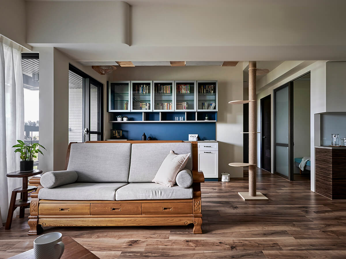 書櫃上方天花板貓跳台的走道同時也修飾了天花板的管線,而麻紗灰、波布藍、胡桃木等餘料打造的貓咪活動空間更是設計師神來一筆的即興創作。