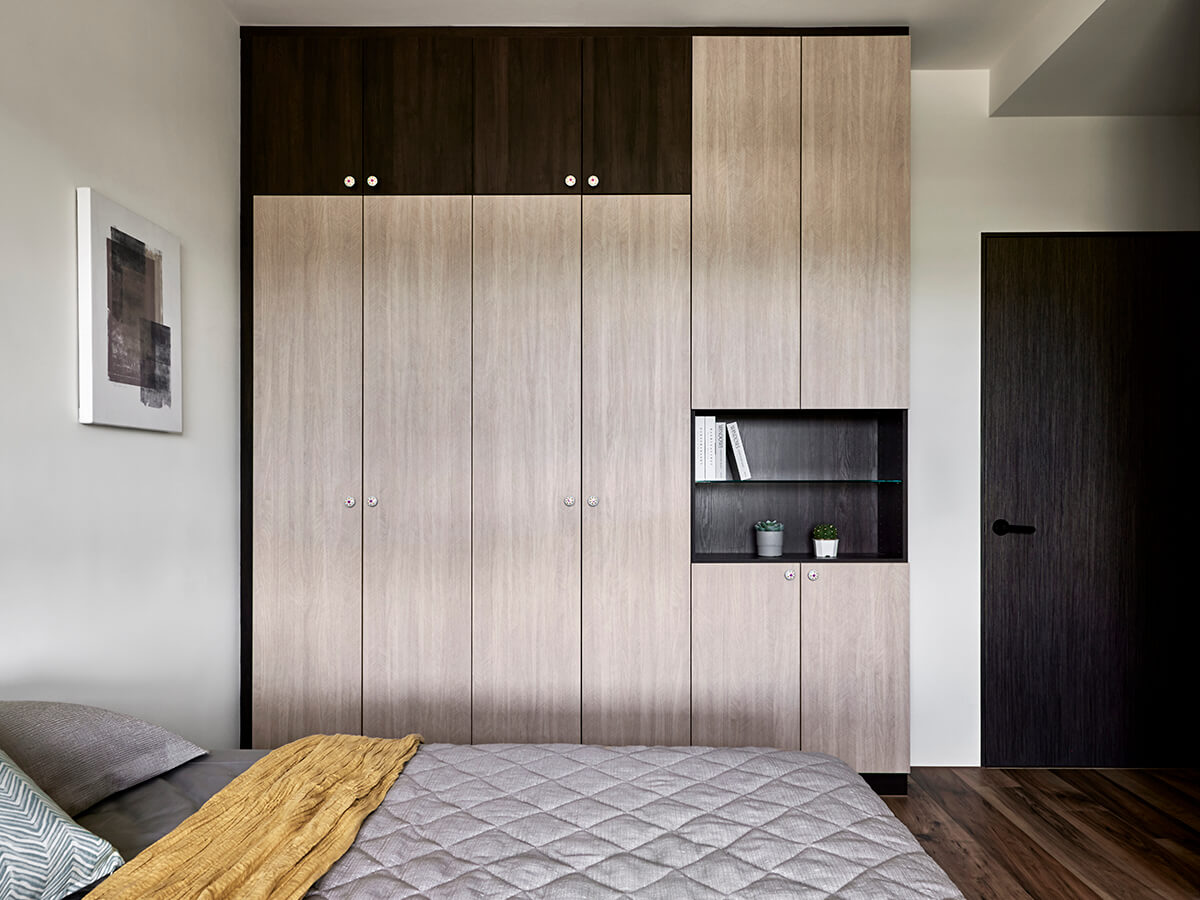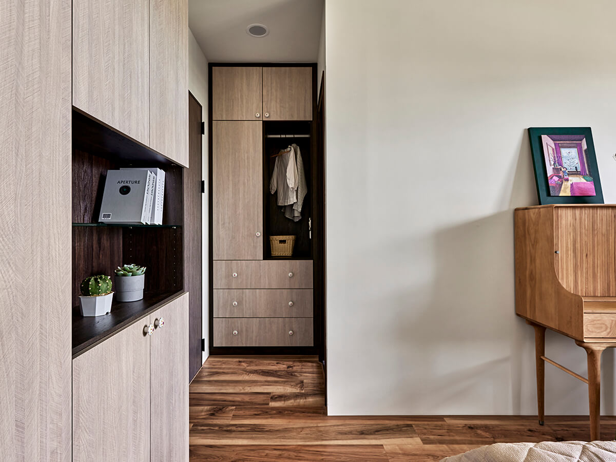 主臥裡的衣櫃以炭橡與日本羽毛木搭配,適時的跳色與簍空,讓視覺充滿層次感。門板上的陶瓷把手,是整座衣櫃清柔的點綴。門後的衣櫃,也以同樣的板材搭配,滿足不同收納需求。