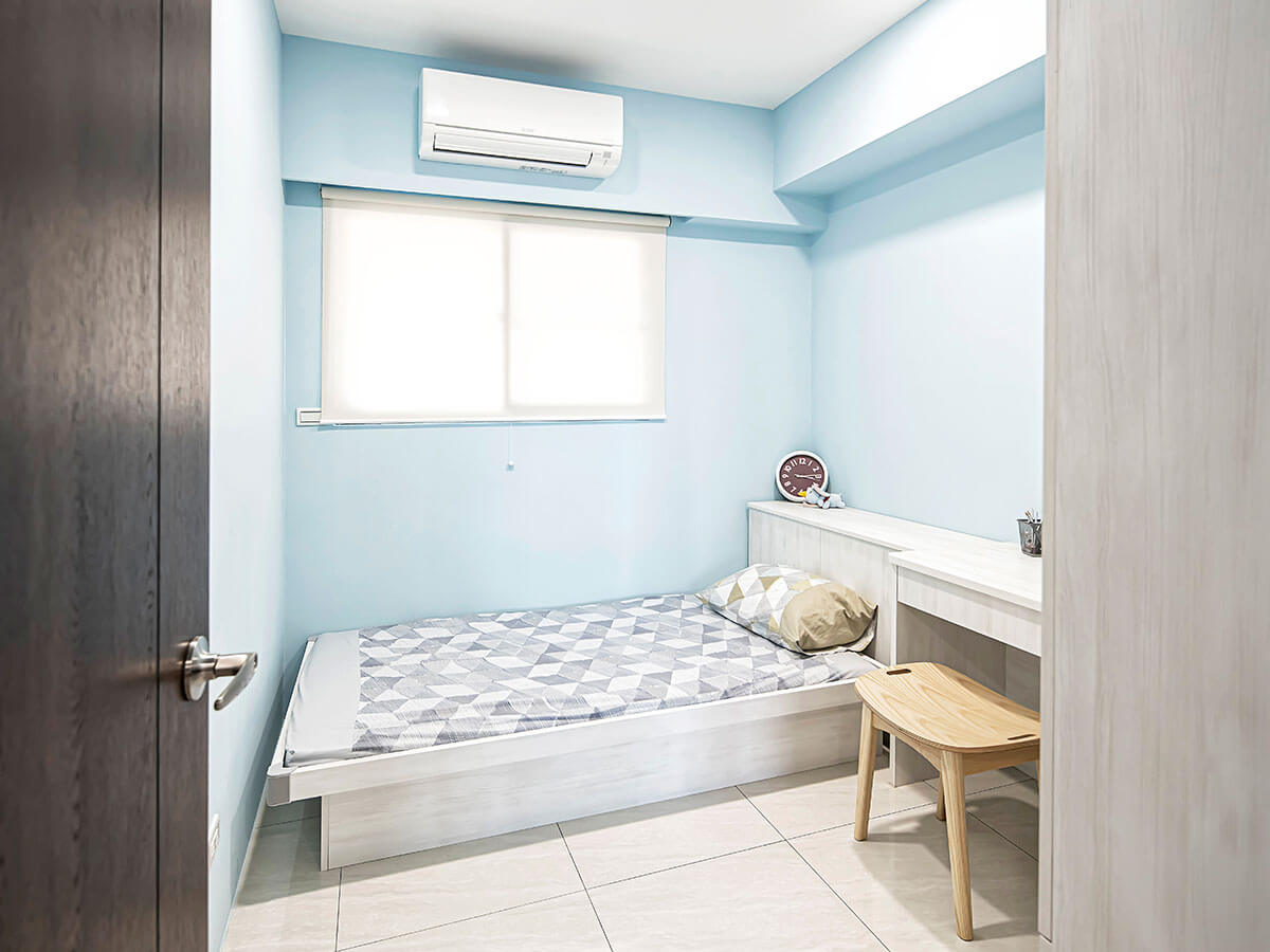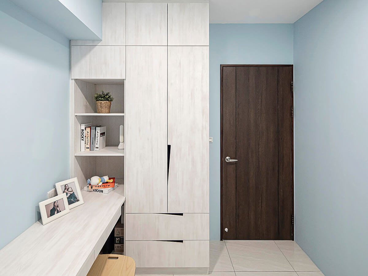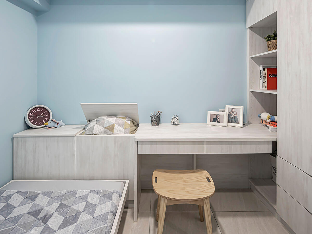 雖說是預留的小孩房,卻已經利用此次施工機會,完成裝潢,暫且先當作客房或書房利用。牆壁刷上淺藍色的塗漆,進一步安裝好沁白色的書桌櫃、系統衣櫃,細長三角形的凹縫把手造型營造出小小的趣味,藍天白雲的色調,令人心情舒朗,睡床基座可向上掀起,收納乾淨被褥於無形;掀蓋式木紋櫃既可容物,也兼當床背板,櫃體往右加長,變身為書桌,直伸入靠牆衣櫃的開放櫃格裡,毫不違和,書桌表面的用度也就隨著加寬加大了。