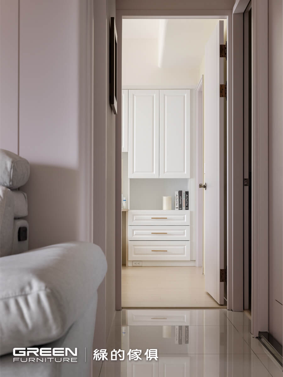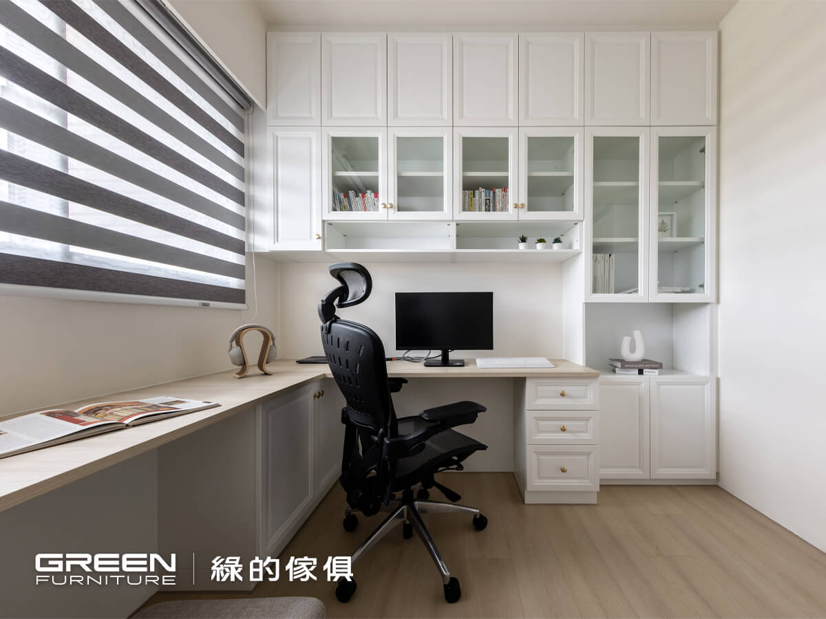 以白詮打造的L型書桌為主軸,門片使用雪白色立體肚板與輕透的清玻搭配,細膩的工藝與考究的異材質,更顯空間獨特性與優雅。