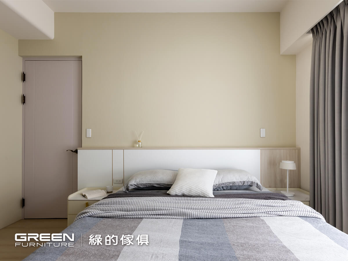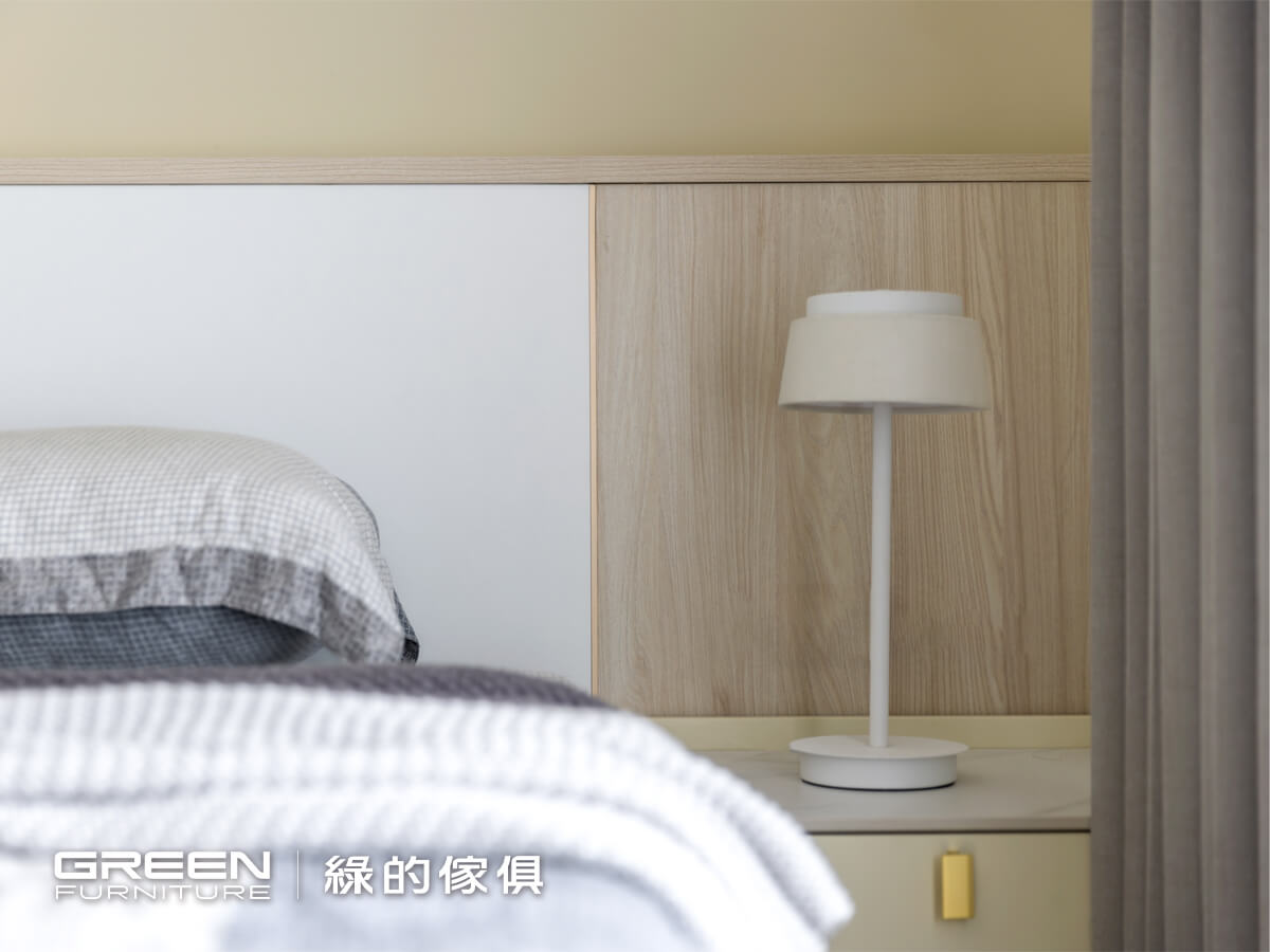 延續著現代法式風格,以白詮打底的床頭壁板,由金色飾條在白色背板上輕輕劃出不對稱的層次。溫暖柔和的黃綠色背牆帶來生動的跳色,在寧靜典雅的環境裡,迎來一股小清新。