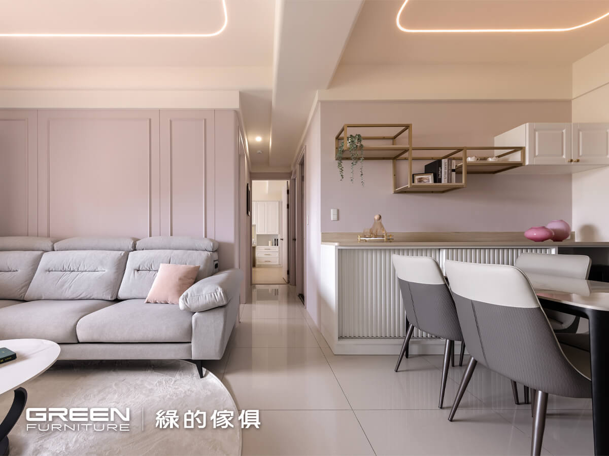 設計師為喜歡圓弧造型的屋主以完整的弧形框出天花板的層次,並沿著圓弧邊框構築線燈,看似低調樸實的風格,卻在不經意中展現著優雅的線條。客廳背牆一致的歐式鄉村風烤漆面板,沒有過多繁複的線條堆疊;一片淨白中,瑰蜜粉牆面的出現帶來些微甜美的氛圍,沿著客餐廳延伸至房間。